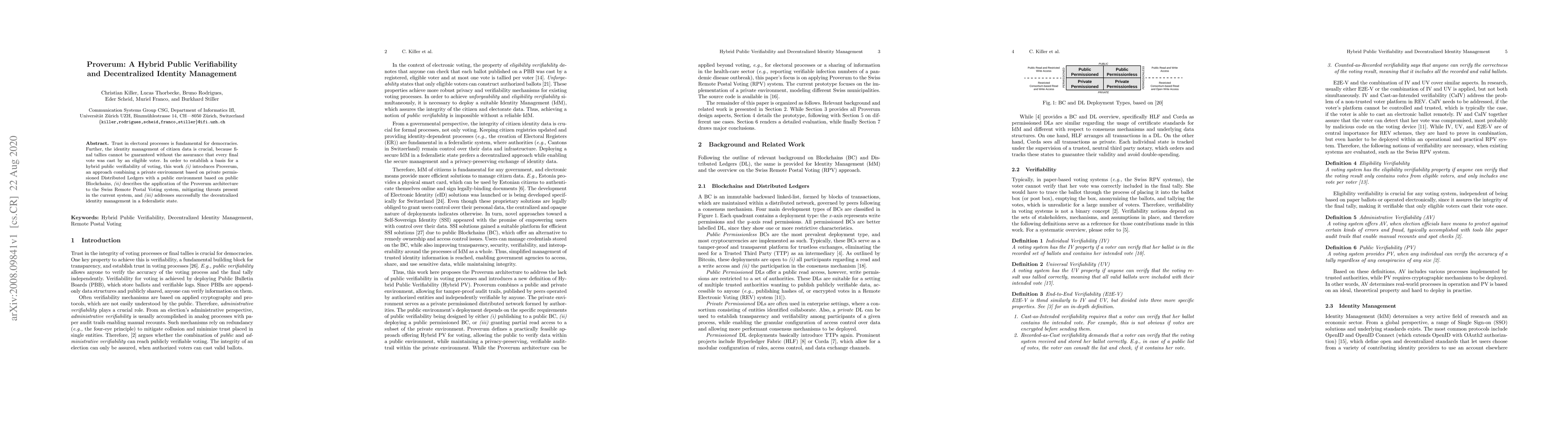 Trust in electoral processes is fundamental for democracies. Further, the identity management of citizen data is crucial, because final tallies cannot be guaranteed without the assurance that every final vote was cast by an eligible voter. In order to establish a basis for a hybrid public verifiability of voting, this work (1) introduces Proverum, an approach combining a private environment based on private permissioned Distributed Ledgers with a public environment based on public Blockchains, (2) describes the application of the Proverum architecture to the Swiss Remote Postal Voting system, mitigating threats present in the current system, and (3) addresses successfully the decentralized identity management in a federalistic state.