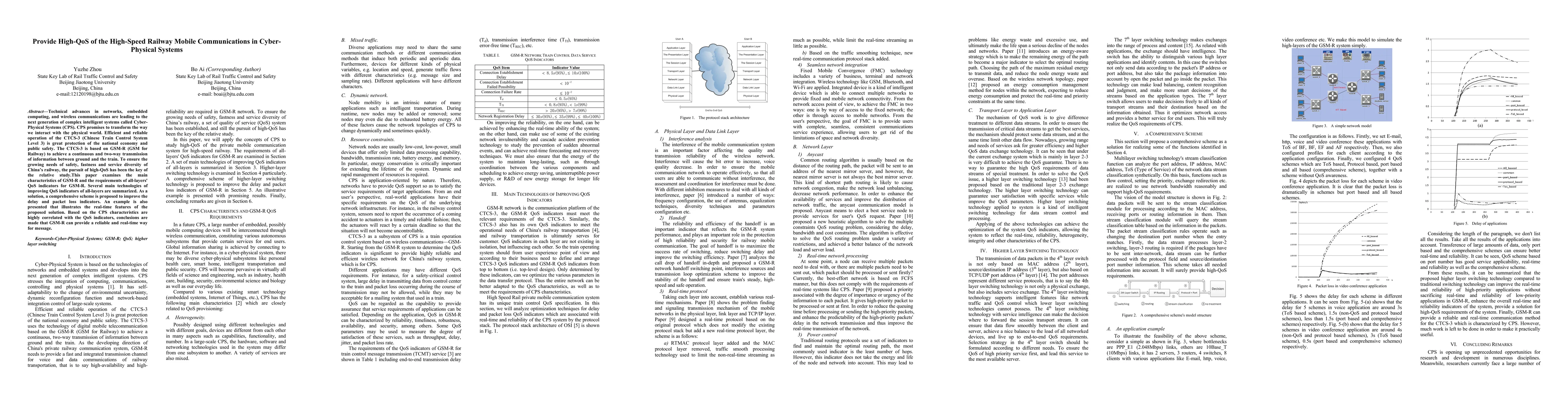 Technical advances in networks, embedded computing, and wireless communications are leading to the next generation of complex intelligent systems called Cyber-Physical Systems (CPS). CPS promises to transform the way we interact with the physical world. Efficient and reliable operation of the CTCS-3 (Chinese Train Control System Level 3) is great protection of the national economy and public safety. The CTCS-3 is based on GSM-R (GSM for Railway) to achieve a continuous and two-way transmission of information between ground and the train. To ensure the growing needs of safety, fastness and service diversity of China's railway, the pursuit of high-QoS has been the key of the relative study. This paper examines the main characteristics of GSM-R and the requirements of all-layers' QoS indicators for GSM-R. Several main technologies of improving QoS indicators of all-layers are summarized. As a solution, a comprehensive scheme is proposed to improve the delay and packet loss indicators. An example is also presented that illustrates the real-time features of the proposed solution. Based on the CPS characteristics are highly correlated with the QoS indicators, conclusions are made that GSM-R can provide a reliable and real-time way for message.
