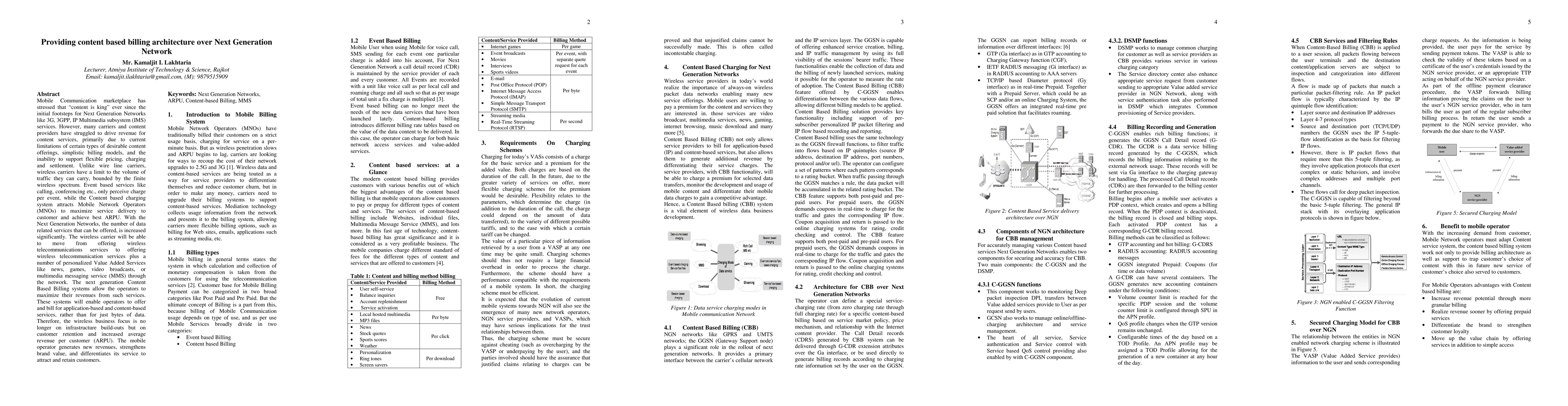Mobile Communication marketplace has stressed that "content is king" ever since the initial footsteps for Next Generation Networks like 3G, 3GPP, IP Multimedia subsystem (IMS) services. However, many carriers and content providers have struggled to drive revenue for content services, primarily due to current limitations of certain types of desirable content offerings, simplistic billing models, and the inability to support flexible pricing, charging and settlement. Unlike wire line carriers, wireless carriers have a limit to the volume of traffic they can carry, bounded by the finite wireless spectrum. Event based services like calling, conferencing etc., only perceive charge per event, while the Content based charging system attracts Mobile Network Operators (MNOs) to maximize service delivery to customer and achieve best ARPU. With the Next Generation Networks, the number of data related services that can be offered, is increased significantly. The wireless carrier will be able to move from offering wireless telecommunications services to offering wireless telecommunication services plus a number of personalized Value Added Services like news, games, video broadcasts, or multimedia messaging service (MMS) through the network. The next generation Content Based Billing systems allow the operators to maximize their revenues from such services. These systems will enable operators to offer and bill for application-based and content-based services, rather than for just bytes of data. Therefore, the wireless business focus is no longer on infrastructure build-outs but on customer retention and increased average revenue per customer (ARPU). The mobile operator generates new revenues, strengthens brand value, and differentiates its service to attract and retain customers.