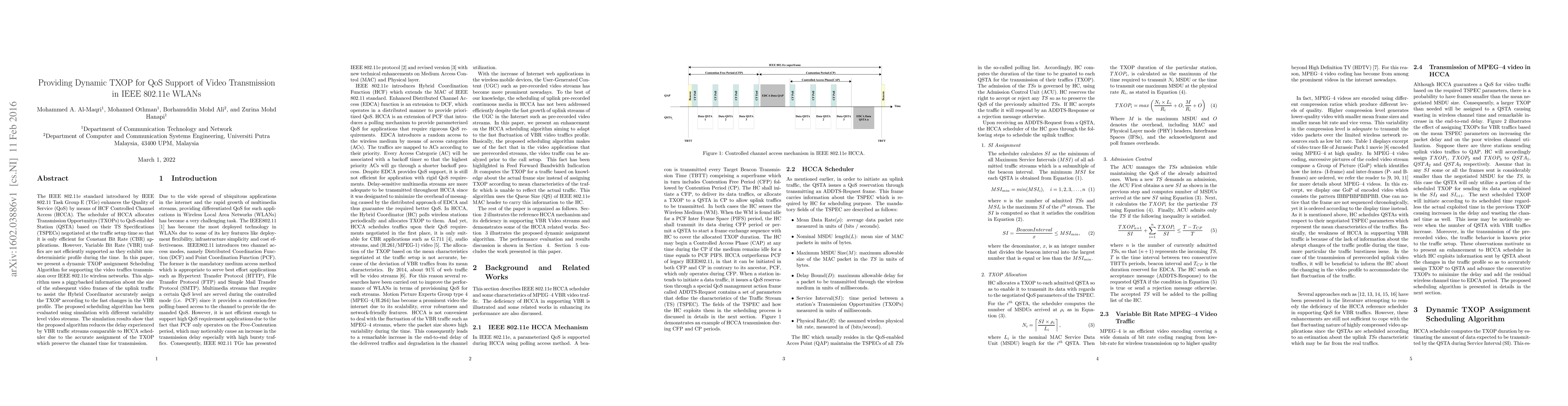The IEEE 802.11e standard introduced by IEEE 802.11 Task Group E (TGe) enhances the Quality of Service (QoS) by means of HCF Controlled Channel Access (HCCA). The scheduler of HCCA allocates Transmission Opportunities (TXOPs) to QoS-enabled Station (QSTA) based on their TS Specifications (TSPECs) negotiated at the traffic setup time so that it is only efficient for Constant Bit Rate (CBR) applications. However, Variable Bit Rate (VBR) traffics are not efficiently supported as they exhibit nondeterministic profile during the time. In this paper, we present a dynamic TXOP assignment Scheduling Algorithm for supporting the video traffics transmission over IEEE 802.11e wireless networks. This algorithm uses a piggybacked information about the size of the subsequent video frames of the uplink traffic to assist the Hybrid Coordinator accurately assign the TXOP according to the fast changes in the VBR profile. The proposed scheduling algorithm has been evaluated using simulation with different variability level video streams. The simulation results show that the proposed algorithm reduces the delay experienced by VBR traffic streams comparable to HCCA scheduler due to the accurate assignment of the TXOP which preserve the channel time for transmission.
