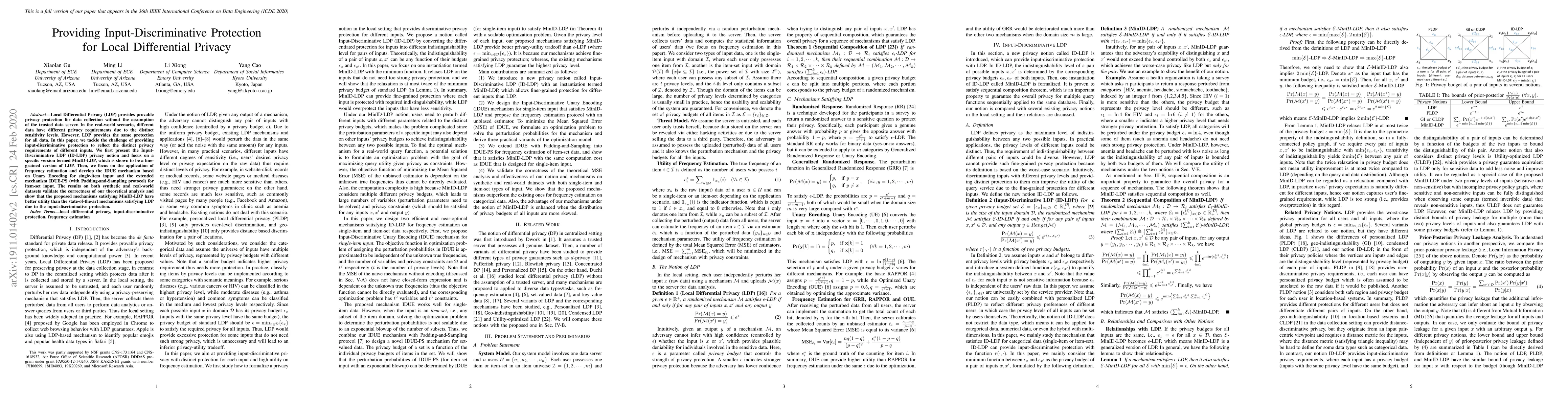 This paper introduces Input-Discriminative Local Differential Privacy (ID-LDP) to provide tailored privacy protection reflecting varying data sensitivity levels. It proposes MinID-LDP and develops mechanisms like IDUE and IDUE-PS for frequency estimation, demonstrating superior utility over standard LDP mechanisms.