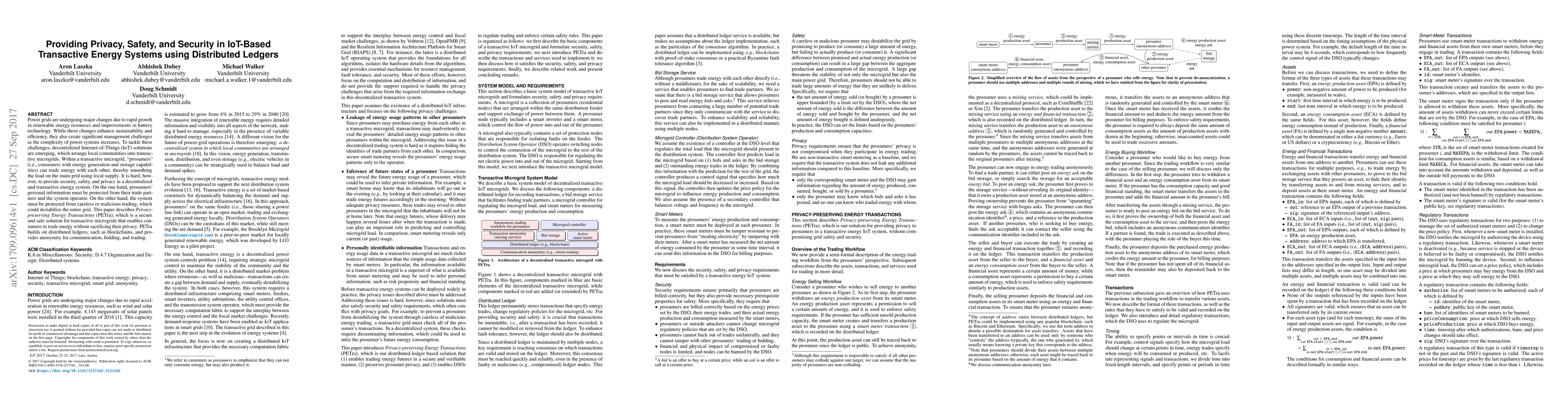 Power grids are undergoing major changes due to rapid growth in renewable energy resources and improvements in battery technology. While these changes enhance sustainability and efficiency, they also create significant management challenges as the complexity of power systems increases. To tackle these challenges, decentralized Internet-of-Things (IoT) solutions are emerging, which arrange local communities into transactive microgrids. Within a transactive microgrid, "prosumers" (i.e., consumers with energy generation and storage capabilities) can trade energy with each other, thereby smoothing the load on the main grid using local supply. It is hard, however, to provide security, safety, and privacy in a decentralized and transactive energy system. On the one hand, prosumers' personal information must be protected from their trade partners and the system operator. On the other hand, the system must be protected from careless or malicious trading, which could destabilize the entire grid. This paper describes Privacy-preserving Energy Transactions (PETra), which is a secure and safe solution for transactive microgrids that enables consumers to trade energy without sacrificing their privacy. PETra builds on distributed ledgers, such as blockchains, and provides anonymity for communication, bidding, and trading.