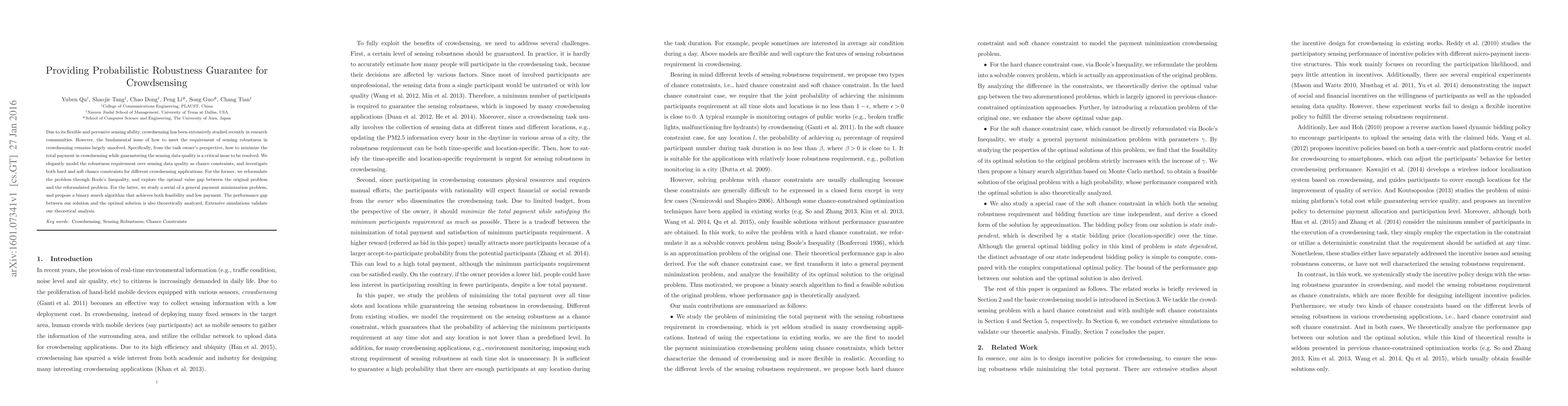 This paper addresses the challenge of ensuring robustness in crowdsensing data quality while minimizing payment costs. It models robustness as chance constraints and proposes methods for both hard and soft constraints, including a binary search algorithm for payment optimization, with theoretical analysis and simulation validation.