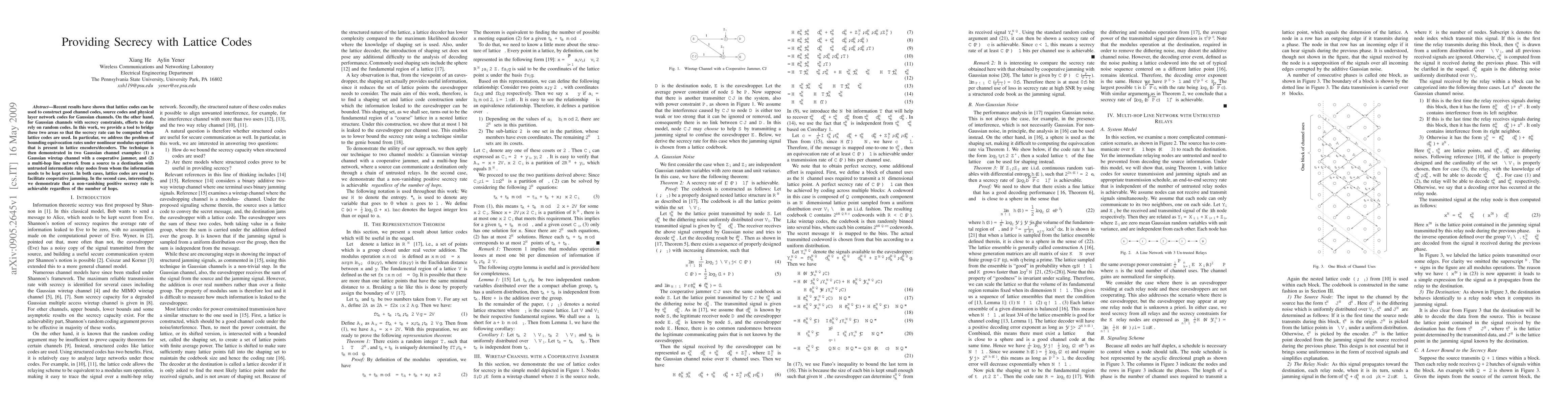This paper introduces lattice codes for secure communication in Gaussian channels with secrecy constraints, providing a method to compute secrecy rates. It demonstrates the technique in two scenarios: a wiretap channel with a cooperative jammer and a multi-hop network with untrusted relays, showing a non-vanishing positive secrecy rate in the latter.