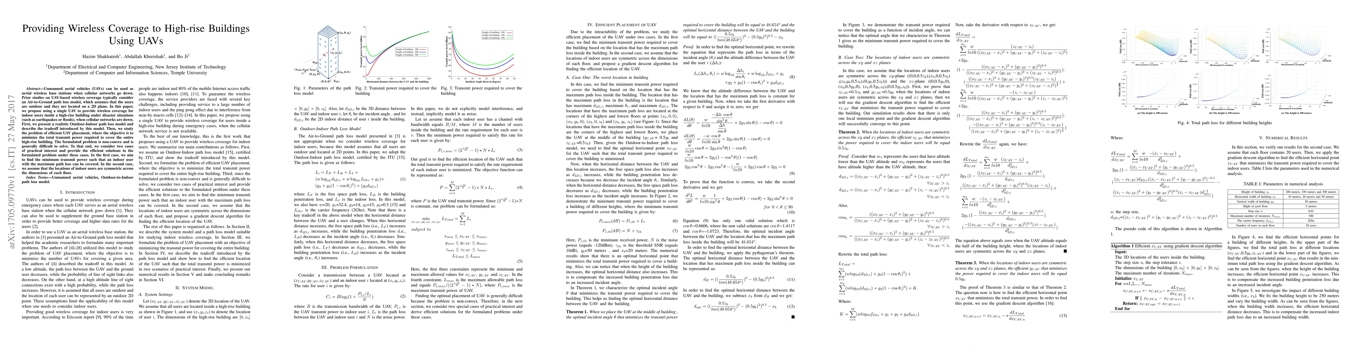 Unmanned aerial vehicles (UAVs) can be used as aerial wireless base stations when cellular networks go down. Prior studies on UAV-based wireless coverage typically consider an Air-to-Ground path loss model, which assumes that the users are outdoor and they are located on a 2D plane. In this paper, we propose using a single UAV to provide wireless coverage for indoor users inside a high-rise building under disaster situations (such as earthquakes or floods), when cellular networks are down. First, we present a realistic Outdoor-Indoor path loss model and describe the tradeoff introduced by this model. Then, we study the problem of efficient UAV placement, where the objective is to minimize the total transmit power required to cover the entire high-rise building. The formulated problem is non-convex and is generally difficult to solve. To that end, we consider two cases of practical interest and provide the efficient solutions to the formulated problem under these cases. In the first case, we aim to find the minimum transmit power such that an indoor user with the maximum path loss can be covered. In the second case, we assume that the locations of indoor users are symmetric across the dimensions of each floor.