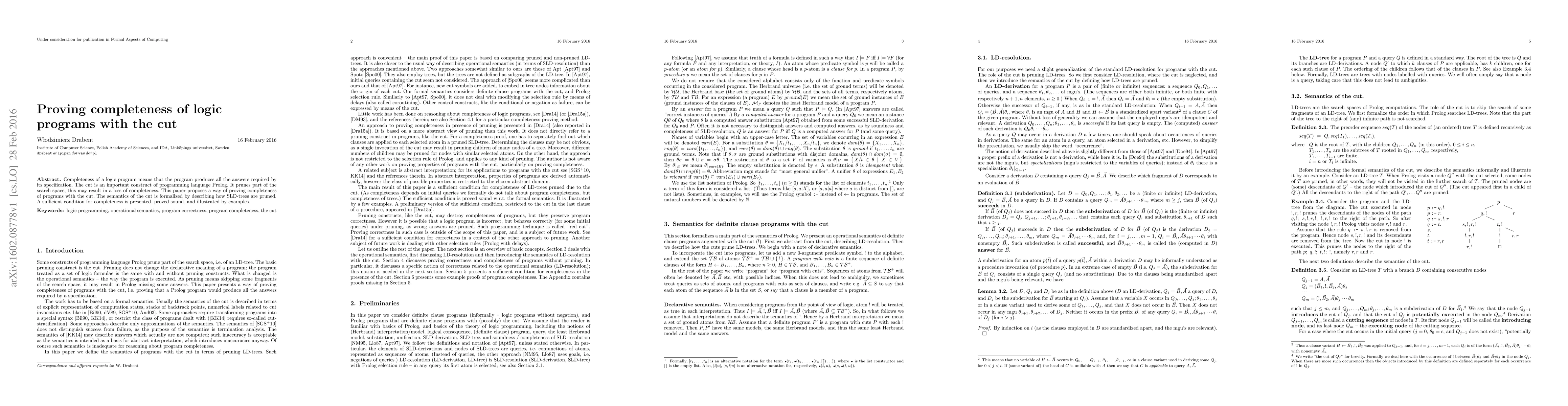 This paper proposes a method for proving the completeness of logic programs that include the cut, a Prolog construct that prunes search space but risks losing completeness. It formalizes the semantics of the cut through SLD-trees pruning and presents a sound sufficient condition for completeness, illustrated by examples.