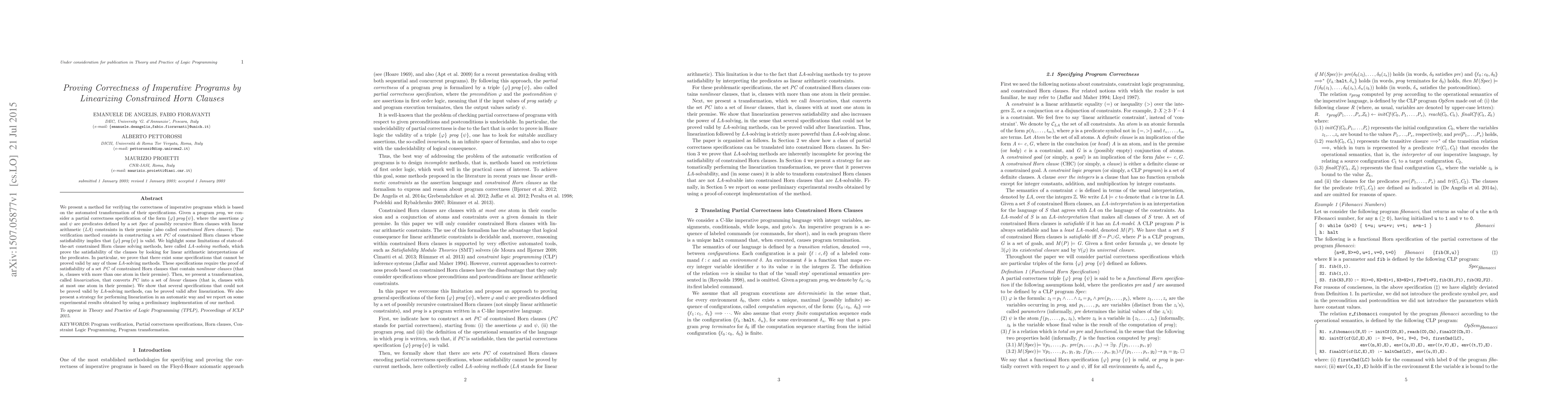 This paper proposes a method for verifying imperative programs by transforming their specifications into a set of constrained Horn clauses. It introduces a linearization technique to convert nonlinear clauses into linear ones, enabling the use of existing linear arithmetic solvers to prove program correctness, addressing limitations of current methods.
