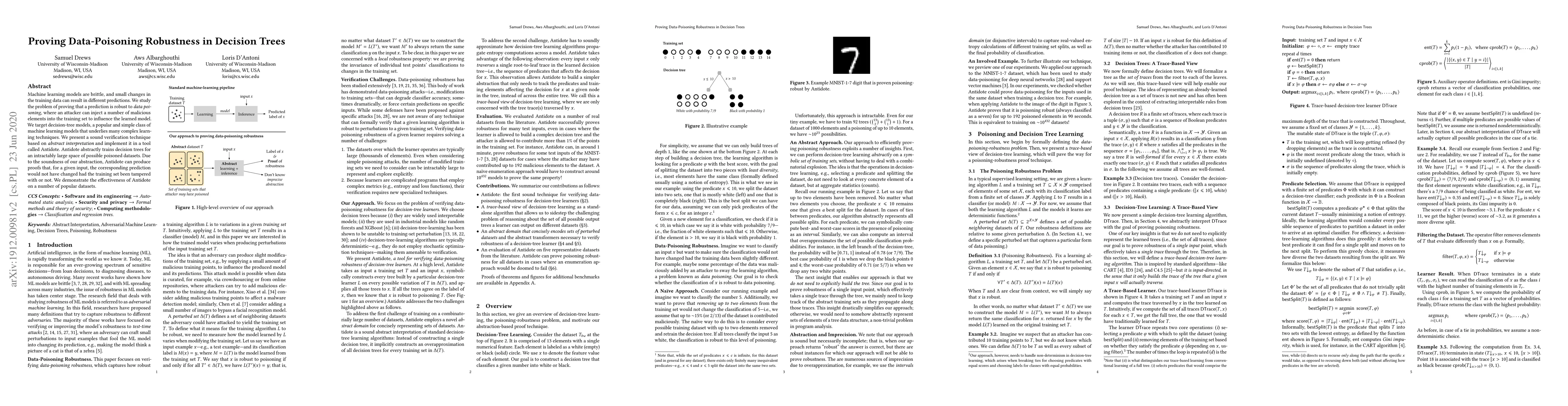 This paper presents a method to verify the robustness of decision trees against data poisoning attacks using abstract interpretation. The tool, Antidote, can prove that predictions remain unchanged under potential malicious data injections, demonstrating effectiveness on various datasets.