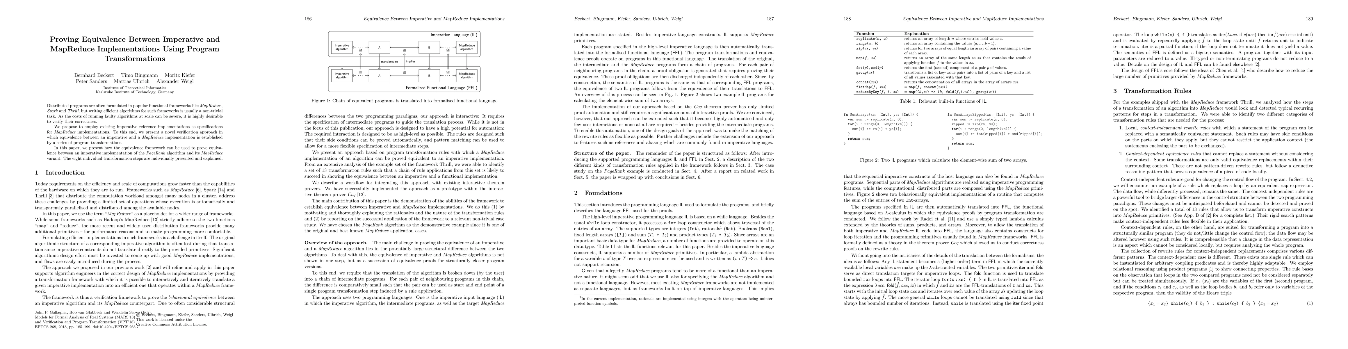 This paper proposes a method to verify the correctness of MapReduce implementations by using imperative reference implementations as specifications. It introduces a series of program transformations to establish equivalence between imperative and MapReduce versions, demonstrating this approach with the PageRank algorithm.