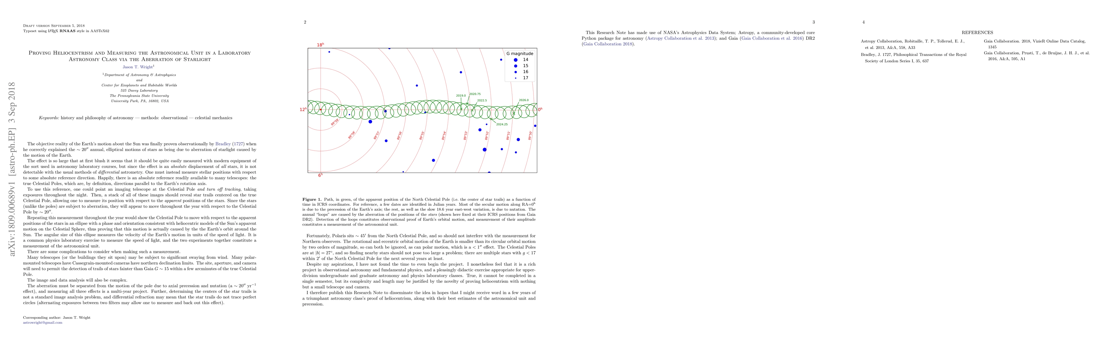 This paper proposes using the aberration of starlight to demonstrate heliocentrism and measure the astronomical unit in a laboratory astronomy class, leveraging Bradley's 18th-century discovery of starlight aberration. The author encourages others to undertake this project to provide a novel, hands-on proof of Earth's motion around the Sun.