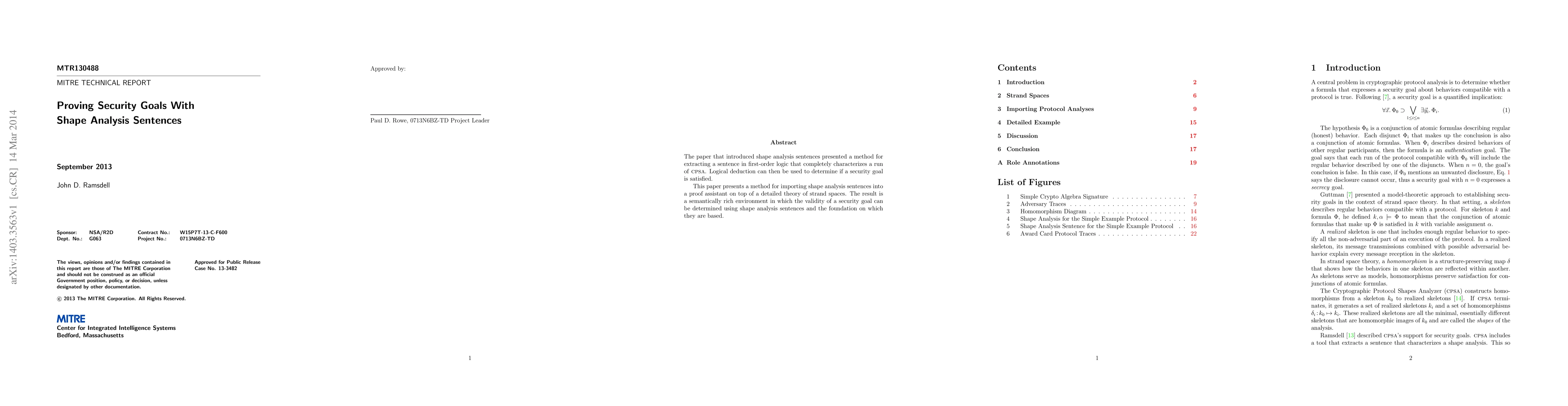 The paper that introduced shape analysis sentences presented a method for extracting a sentence in first-order logic that completely characterizes a run of CPSA. Logical deduction can then be used to determine if a security goal is satisfied. This paper presents a method for importing shape analysis sentences into a proof assistant on top of a detailed theory of strand spaces. The result is a semantically rich environment in which the validity of a security goal can be determined using shape analysis sentences and the foundation on which they are based.