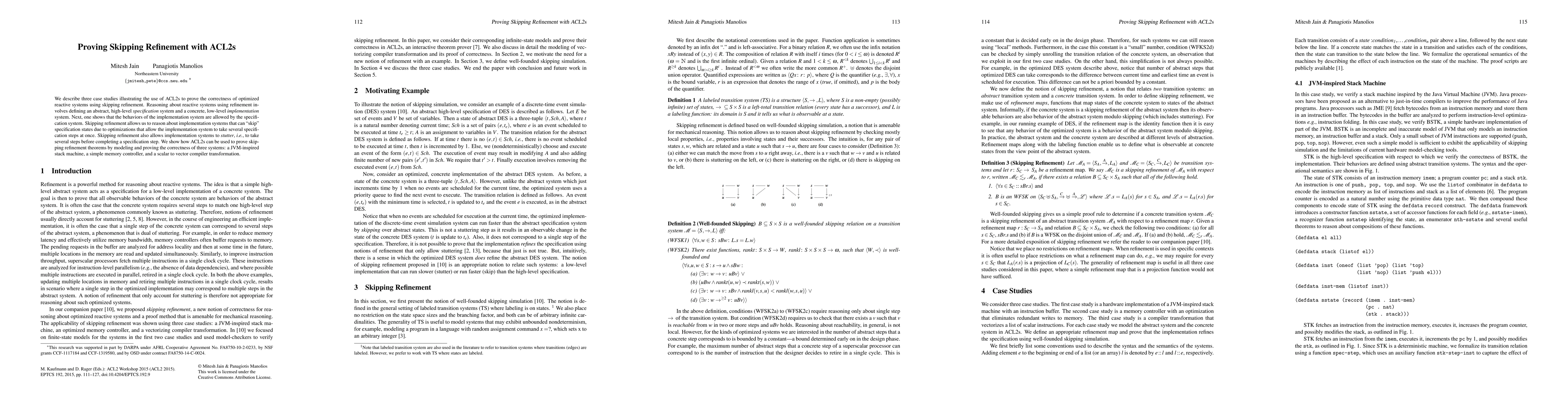 This paper demonstrates the use of ACL2s to prove the correctness of optimized reactive systems through skipping refinement, focusing on three case studies: a JVM-inspired stack machine, a memory controller, and a compiler transformation. The method allows reasoning about systems that can skip specification states due to optimizations.