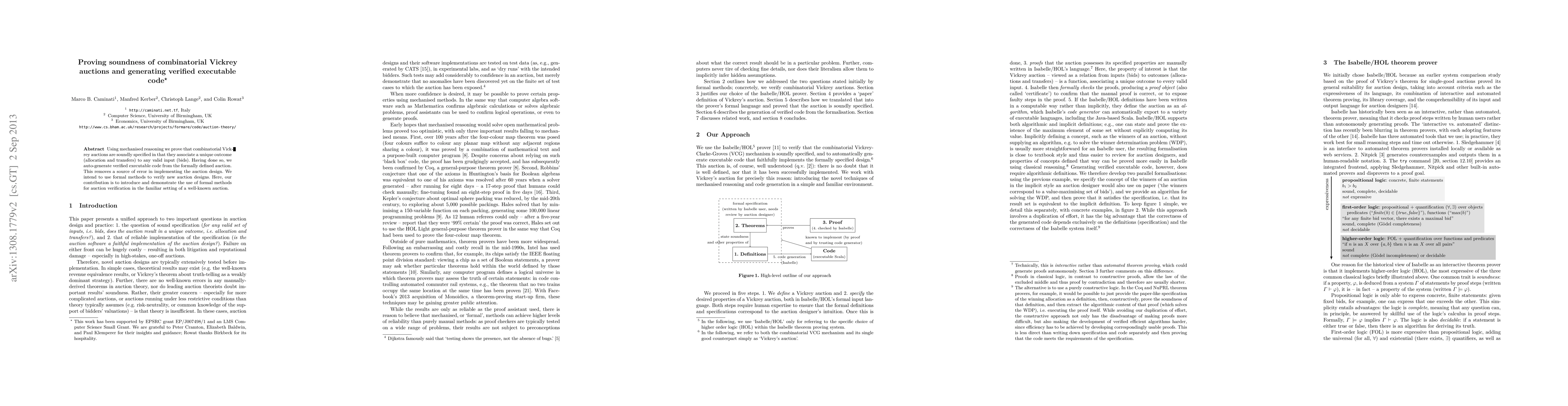 This paper uses mechanised reasoning to prove the soundness of combinatorial Vickrey auctions, ensuring a unique outcome for valid bids, and generates verified executable code from the formal specification, thereby eliminating potential implementation errors. The authors aim to extend this formal verification approach to new auction designs.