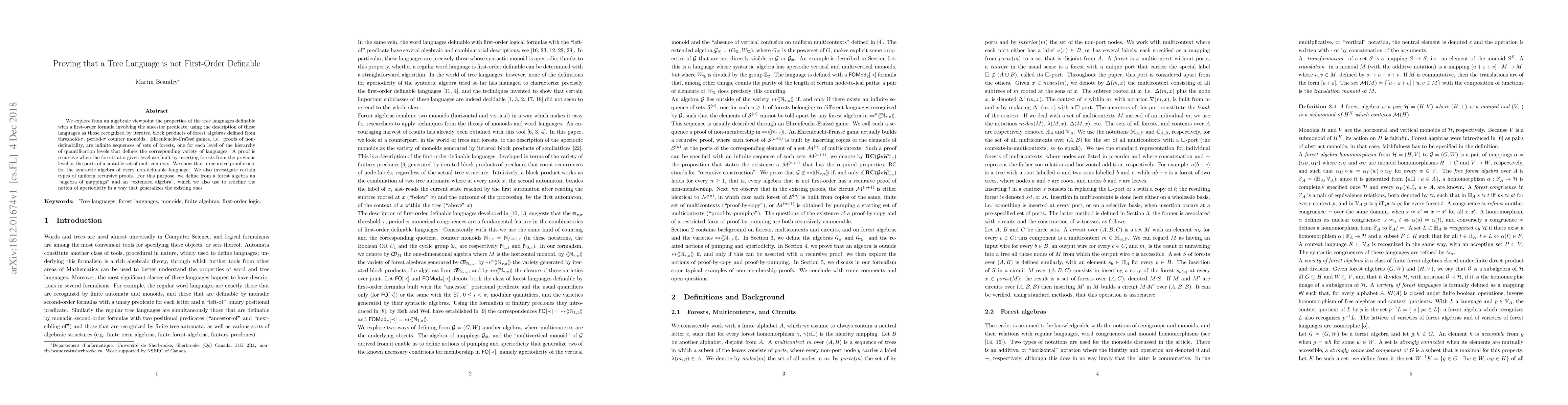 We explore from an algebraic viewpoint the properties of the tree languages definable with a first-order formula involving the ancestor predicate, using the description of these languages as those recognized by iterated block products of forest algebras defined from finite counter monoids. Proofs of nondefinability are infinite sequences of sets of forests, one for each level of the hierarchy of quantification levels that defines the corresponding variety of languages. The forests at a given level are built recursively by inserting forests from previous level at the ports of a suitable set of multicontexts. We show that a recursive proof exists for the syntactic algebra of every non-definable language. We also investigate certain types of uniform recursive proofs. For this purpose, we define from a forest algebra an algebra of mappings and an extended algebra, which we also use to redefine the notion of aperiodicity in a way that generalizes the existing ones.