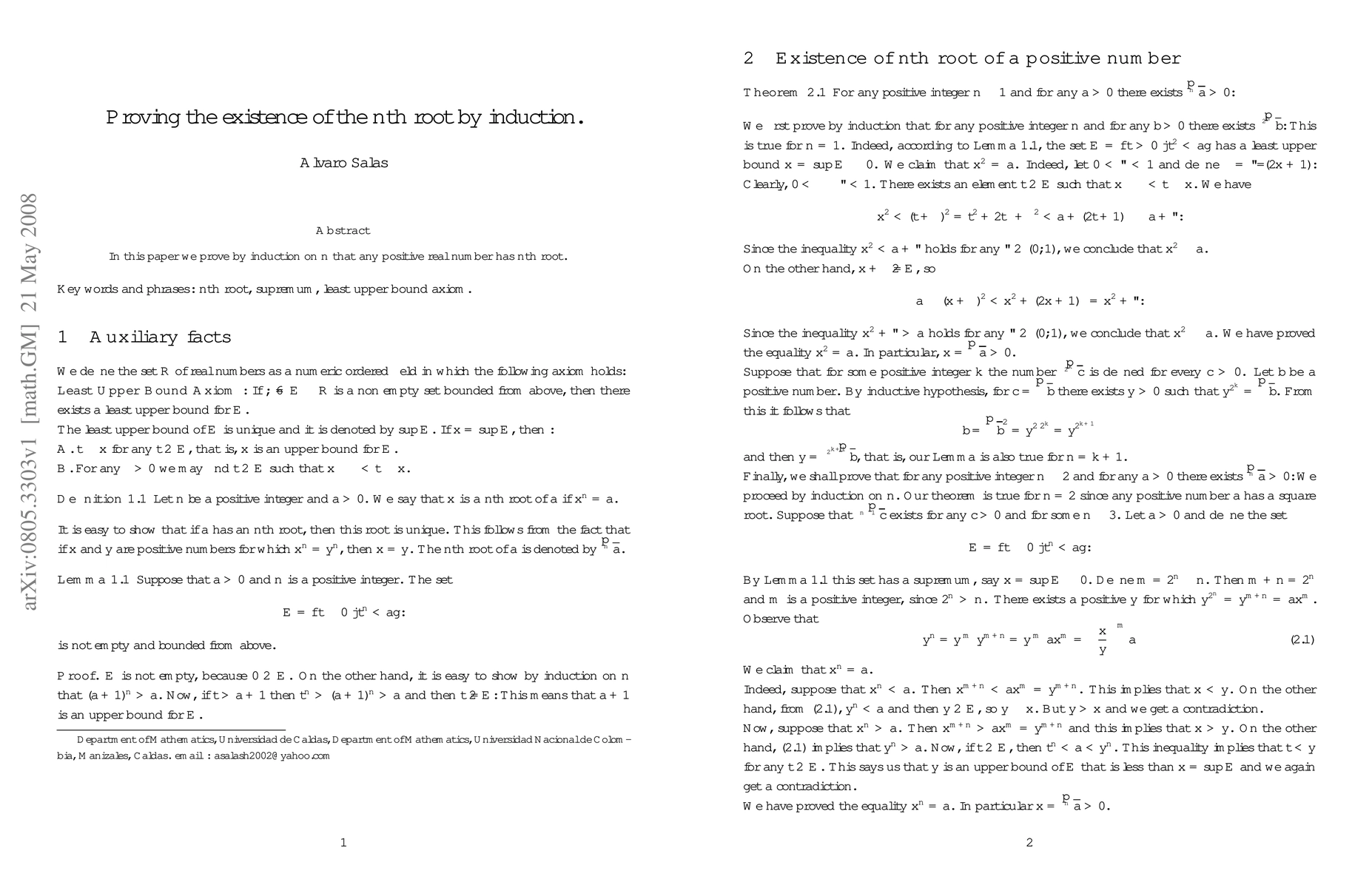 Summary: This paper demonstrates through mathematical induction that any positive real number possesses an $n$th root for every positive integer $n$. The proof establishes the foundational case and inductive step to affirm the existence of such roots.