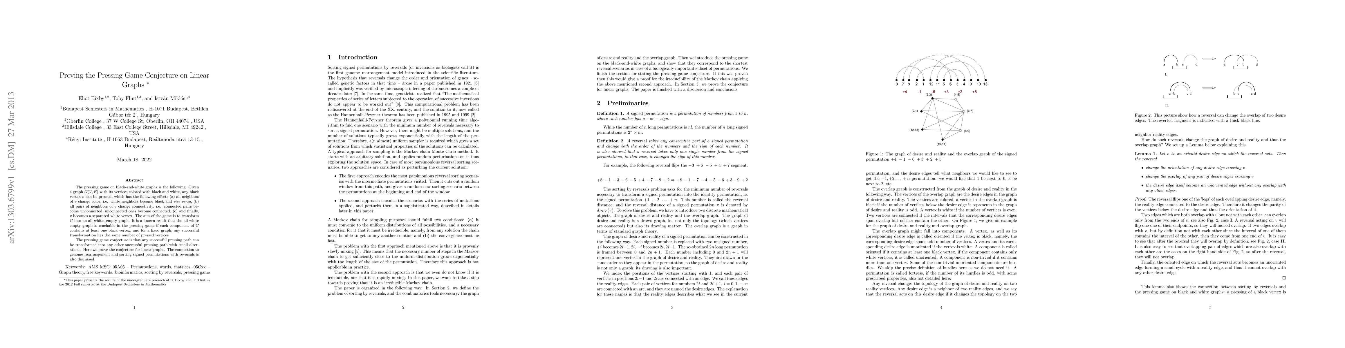 Researchers prove the pressing game conjecture for linear graphs, showing that any successful transformation can be altered into another with minimal changes, with implications for genome rearrangement and sorting signed permutations.