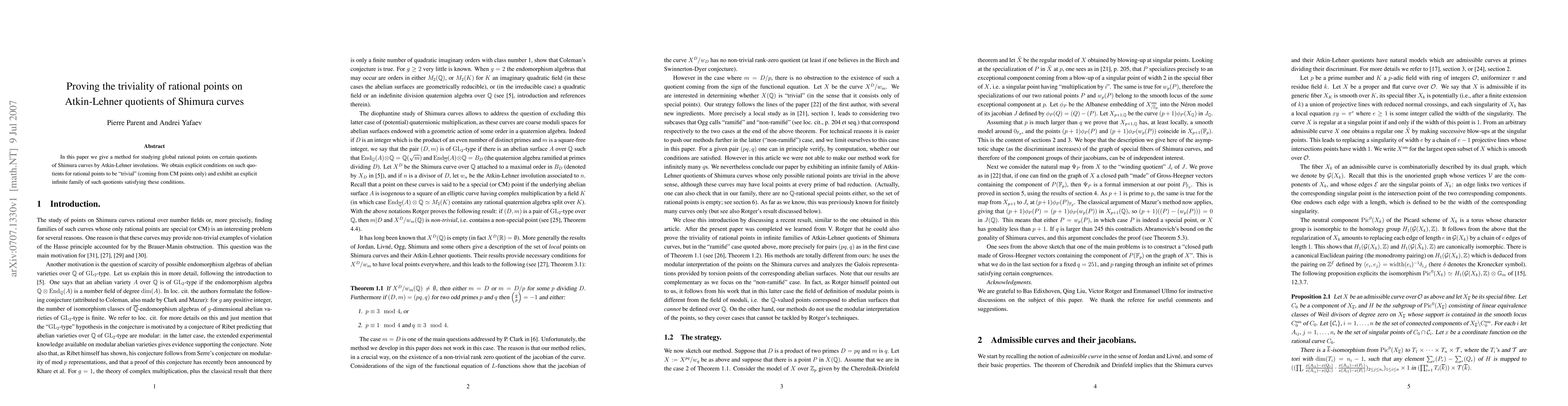 In this paper we give a method for studying global rational points on certain quotients of Shimura curves by Atkin-Lehner involutions. We obtain explicit conditions on such quotients for rational points to be ``trivial'' (coming from CM points only) and exhibit an explicit infinite family of such quotients satisfying these conditions.
