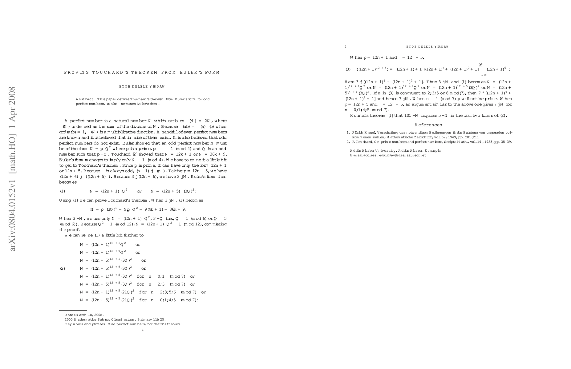 Touchard's theorem is derived from Euler's form related to odd perfect numbers, with an emphasis on refining Euler's existing mathematical structure. This work provides a novel derivation linking combinatorial identities to number theory.