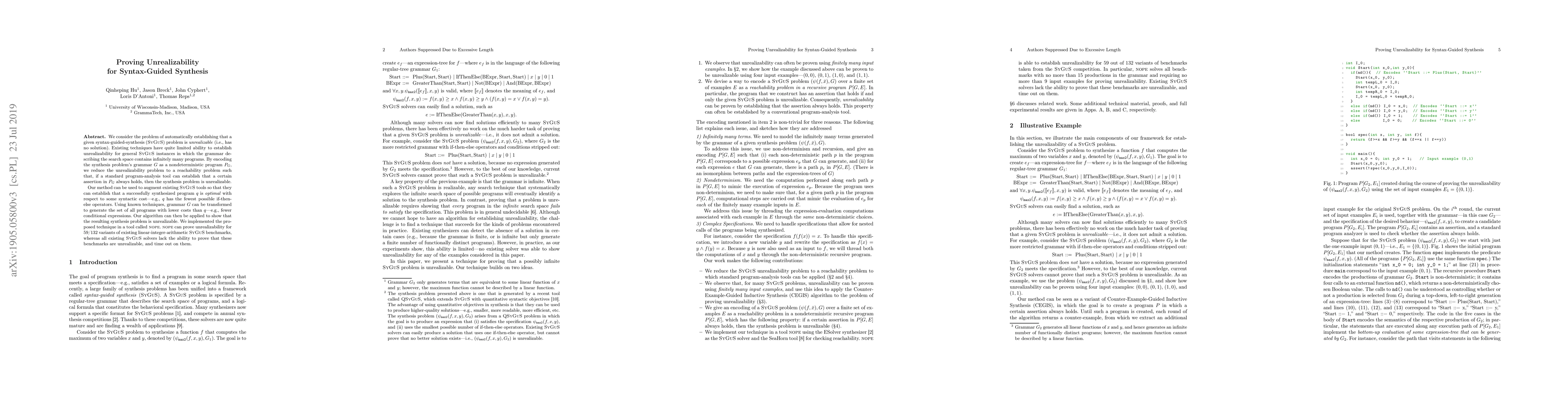 Proving Unrealizability for Syntax-Guided Synthesis We consider the problem of automatically establishing that a given syntax-guided-synthesis (SyGuS) problem is unrealizable (i.e., has no solution). Existing techniques have quite limited ability to establish unrealizability for general SyGuS instances in which the grammar describing the search space contains infinitely many programs. By encoding the synthesis problem's grammar G as a nondeterministic program P_G, we reduce the unrealizability problem to a reachability problem such that, if a standard program-analysis tool can establish that a certain assertion in P_G always holds, then the synthesis problem is unrealizable. Our method can be used to augment any existing SyGus tool so that it can establish that a successfully synthesized program q is optimal with respect to some syntactic cost -- e.g., q has the fewest possible if-then-else operators. Using known techniques, grammar G can be automatically transformed to generate exactly all programs with lower cost than q -- e.g., fewer conditional expressions. Our algorithm can then be applied to show that the resulting synthesis problem is unrealizable. We implemented the proposed technique in a tool called NOPE. NOPE can prove unrealizability for 59/134 variants of existing linear-integer-arithmetic SyGus benchmarks, whereas all existing SyGus solvers lack the ability to prove that these benchmarks are unrealizable, and time out on them.
