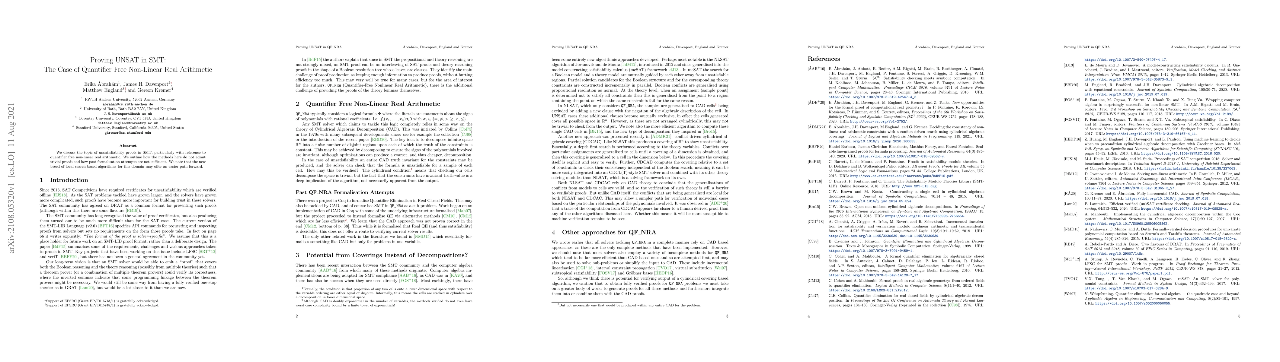 Researchers discuss challenges in proving unsatisfiability in SMT, particularly with quantifier-free non-linear real arithmetic, highlighting the limitations of past formalization attempts and potential benefits of new local search algorithms.