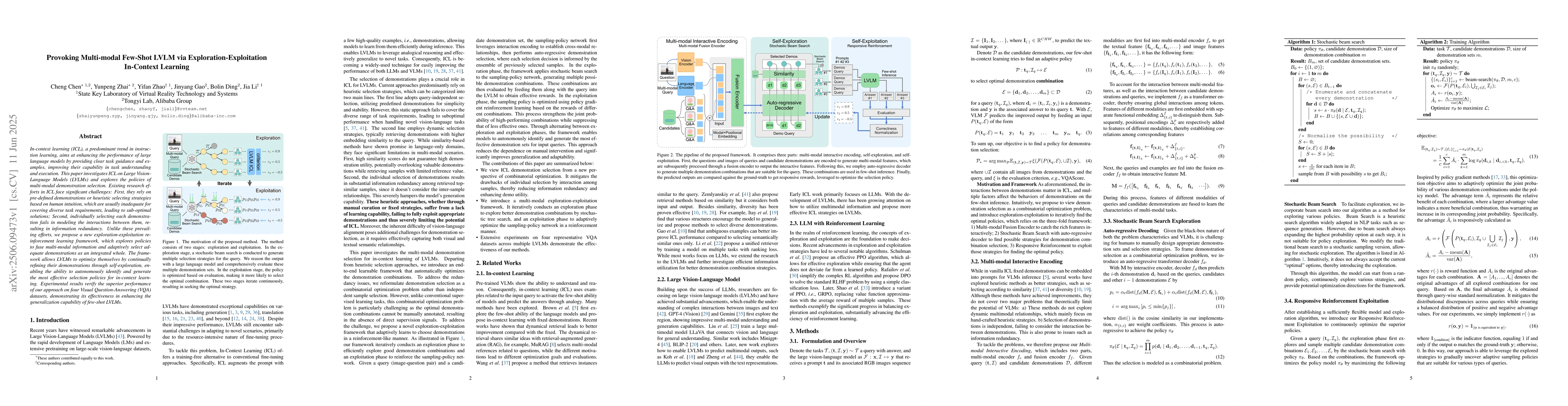 This paper proposes a new exploration-exploitation framework for few-shot Large Vision-Language Models (LVLMs) to enhance their performance in Visual Question-Answering (VQA) tasks through multi-modal demonstration selection.
