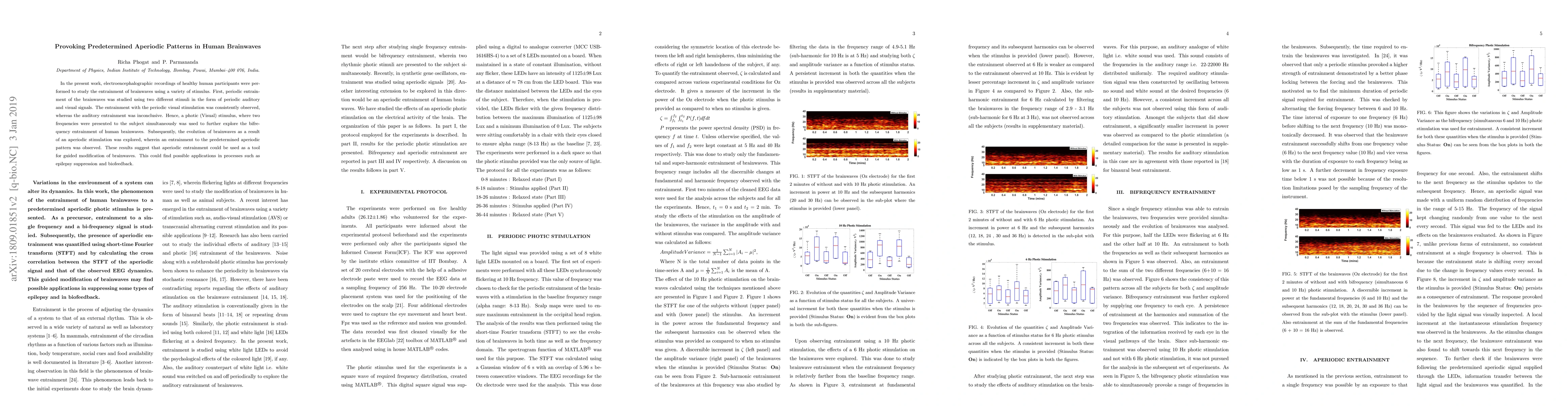 In the present work, electroencephalographic recordings of healthy human participants were performed to study the entrainment of brainwaves using a variety of stimulus. First, periodic entrainment of the brainwaves was studied using two different stimuli in the form of periodic auditory and visual signals. The entrainment with the periodic visual stimulation was consistently observed, whereas the auditory entrainment was inconclusive. Hence, a photic (Visual) stimulus, where two frequencies were presented to the subject simultaneously was used to further explore the bifrequency entrainment of human brainwaves. Subsequently, the evolution of brainwaves as a result of an aperiodic stimulation was explored, wherein an entrainment to the predetermined aperiodic pattern was observed. These results suggest that aperiodic entrainment could be used as a tool for guided modification of brainwaves. This could find possible applications in processes such as epilepsy suppression and biofeedback.