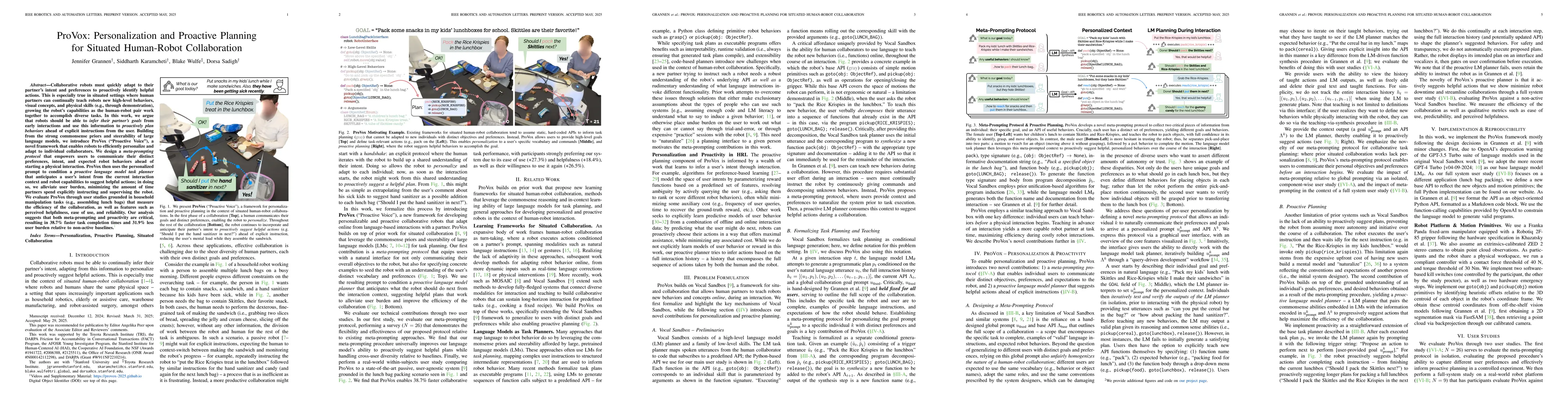 The research introduces ProVox, a framework enabling robots to personalize and adapt to individual human collaborators by inferring their goals from early interactions and proactively planning behaviors. Evaluated through user studies, ProVox resulted in 38.7% faster task completion times and 31.9% less user burden compared to non-active baselines, highlighting the importance of personalization and proactivity in human-robot collaboration.