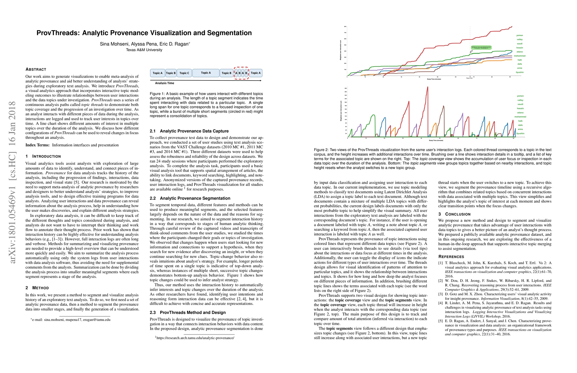 ProvThreads is a visual analytics tool designed to enhance the understanding of analytic provenance during exploratory text analysis by visualizing interactive topic modeling outcomes. It uses topic threads to illustrate the relationships between user interactions and data topics, revealing changes in focus over time through logged interactions and line charts showing topic interest progression.