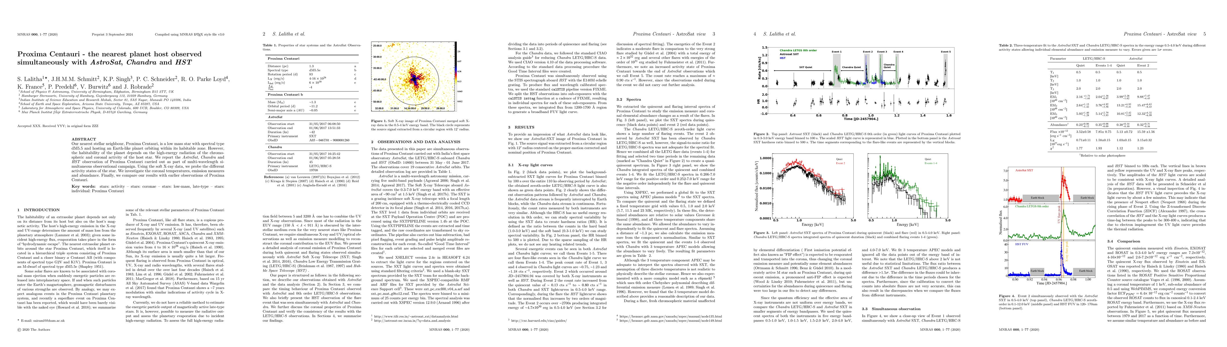 This study reports simultaneous observations of Proxima Centauri, the nearest star with an Earth-like planet in its habitable zone, using Astrosat, Chandra, and HST. The research analyzes the star's high-energy radiation, coronal temperatures, and activity states to assess the planet's habitability, comparing these findings with previous observations.