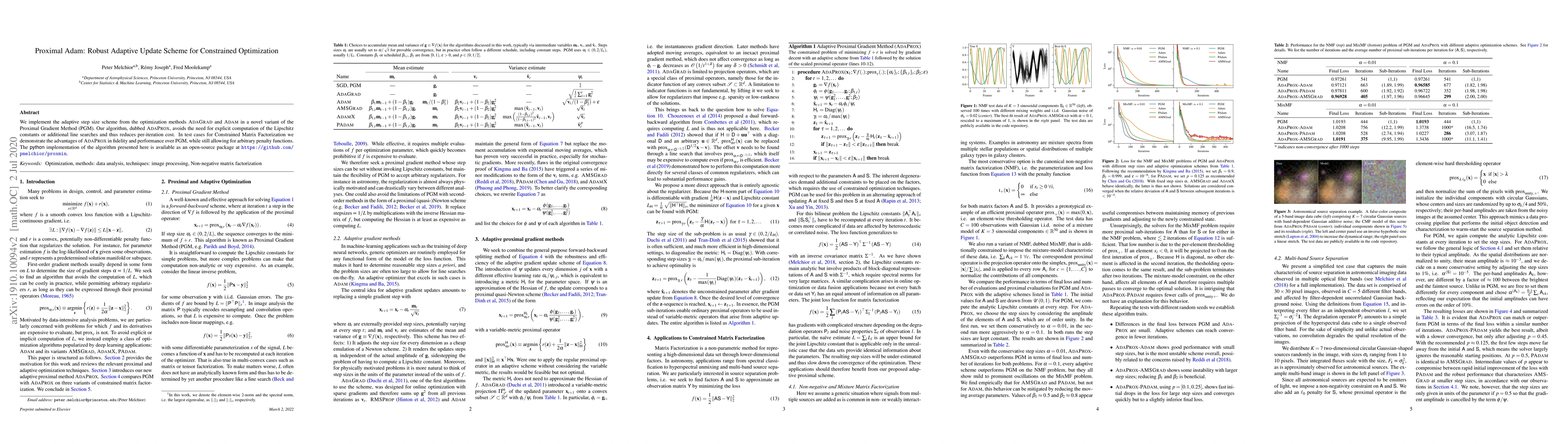 The paper introduces AdaProx, a novel adaptive update scheme combining elements of AdaGrad and Adam within the Proximal Gradient Method, which reduces computational cost and improves performance in constrained optimization tasks like Matrix Factorization. The open-source implementation is available for further exploration.