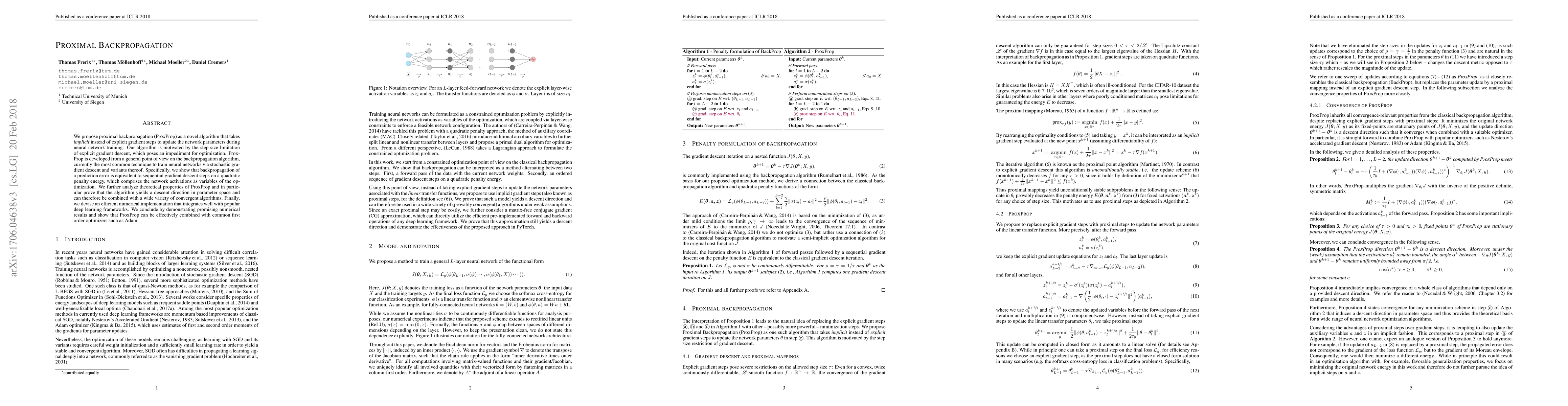 A new algorithm called Proximal Backpropagation (ProxProp) is proposed to improve neural network training by taking implicit gradient steps instead of explicit ones, overcoming a limitation in traditional methods.