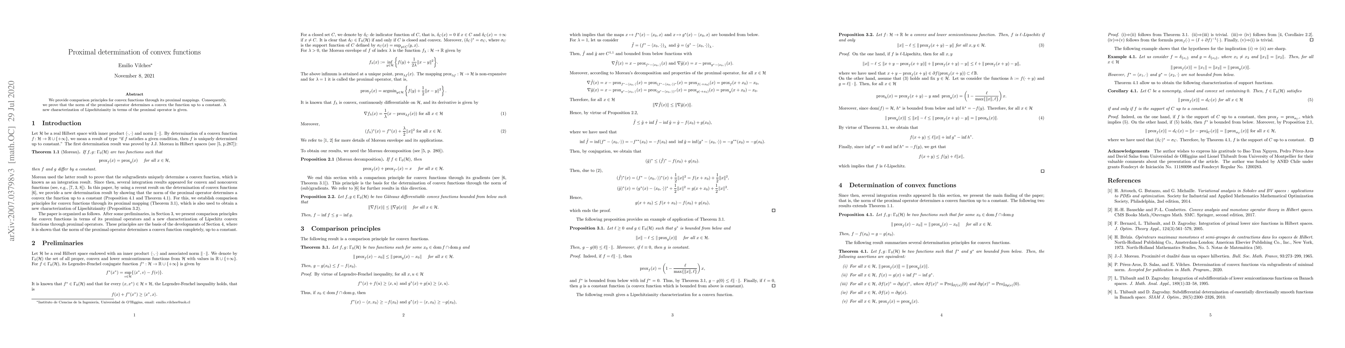 This paper provides comparison principles for convex functions through their proximal mappings, proving that the norm of the proximal operator determines a convex function up to a constant, offering a new characterization of Lipsitzianity in terms of the proximal operator.
