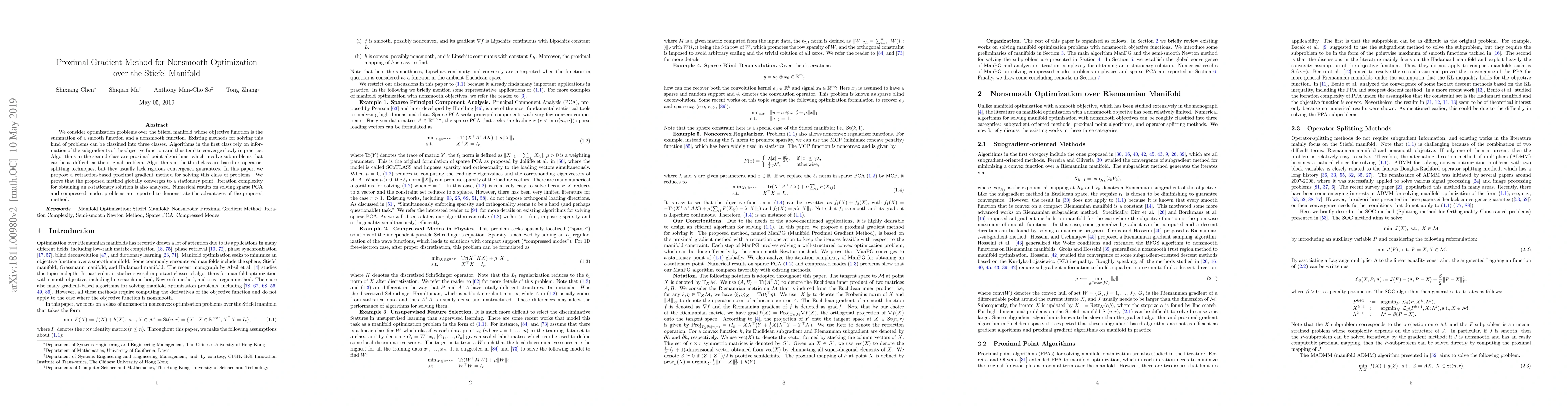 We consider optimization problems over the Stiefel manifold whose objective function is the summation of a smooth function and a nonsmooth function. Existing methods for solving this kind of problems can be classified into three classes. Algorithms in the first class rely on information of the subgradients of the objective function and thus tend to converge slowly in practice. Algorithms in the second class are proximal point algorithms, which involve subproblems that can be as difficult as the original problem. Algorithms in the third class are based on operator-splitting techniques, but they usually lack rigorous convergence guarantees. In this paper, we propose a retraction-based proximal gradient method for solving this class of problems. We prove that the proposed method globally converges to a stationary point. Iteration complexity for obtaining an $\epsilon$-stationary solution is also analyzed. Numerical results on solving sparse PCA and compressed modes problems are reported to demonstrate the advantages of the proposed method.