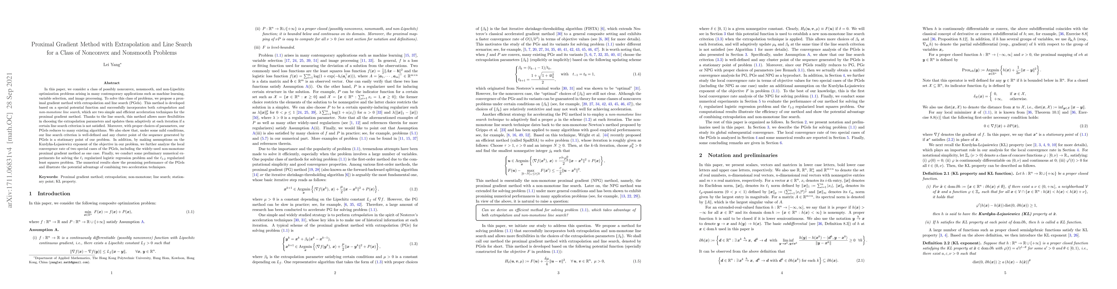 This paper proposes a proximal gradient method with extrapolation and line search (PGels) to tackle nonconvex, nonsmooth optimization problems. The method incorporates both extrapolation and adaptive non-monotone line search, ensuring flexibility and efficiency, and demonstrates local convergence under certain conditions. Numerical experiments show the effectiveness of PGels in solving $\ell_1$ regularized logistic regression and $\ell_{1\text{-}2}$ regularized least squares problems.