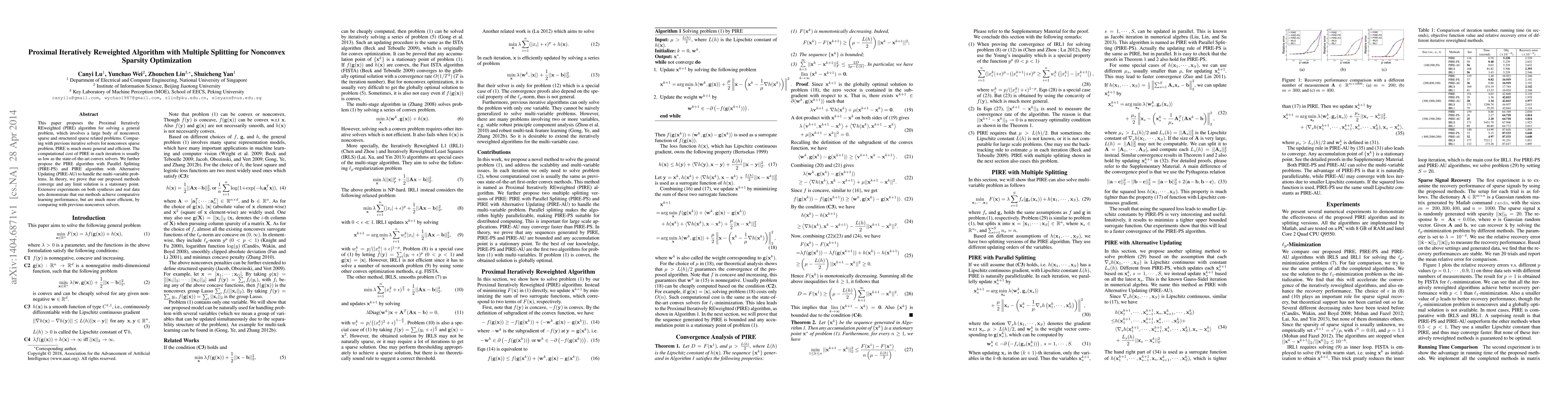 This paper introduces the Proximal Iteratively REweighted (PIRE) algorithm for solving nonconvex sparse optimization problems, showing it to be more general and efficient than previous methods. The authors also propose PIRE-PS and PIRE-AU for multi-variable problems, proving their convergence and efficiency, which is demonstrated through experiments on synthetic and real datasets.