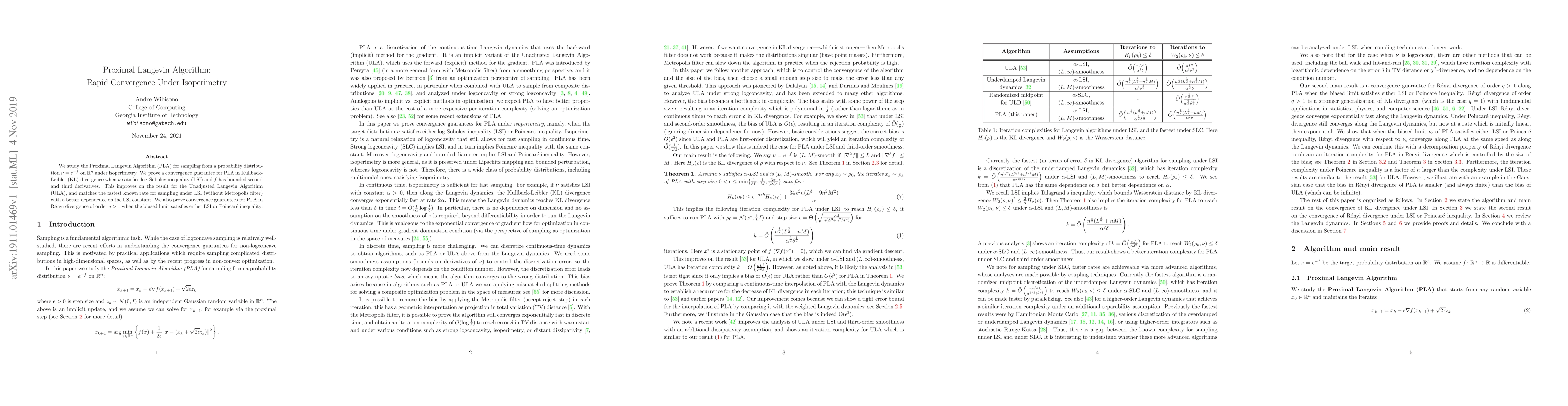 The Proximal Langevin Algorithm (PLA) converges rapidly in KL divergence under isoperimetry when the distribution satisfies log-Sobolev inequality and the potential function has bounded second and third derivatives. PLA matches the fastest known rate for sampling under LSI without Metropolis filter, with improved dependence on the LSI constant.