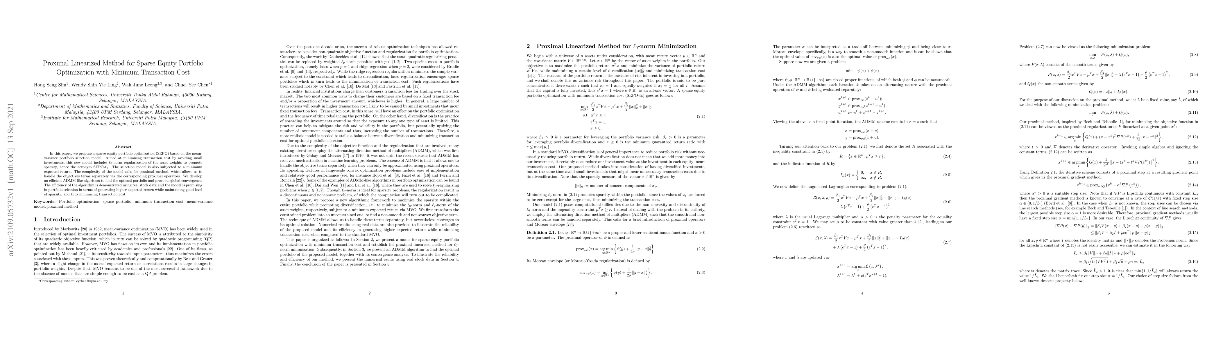 In this paper, we propose a sparse equity portfolio optimization (SEPO) based on the mean-variance portfolio selection model. Aimed at minimizing transaction cost by avoiding small investments, this new model includes $\ell_0$-norm regularization of the asset weights to promote sparsity, hence the acronym SEPO-$\ell_0$. The selection model is also subjected to a minimum expected return. The complexity of the model calls for proximal method, which allows us to handle the objectives terms separately via the corresponding proximal operators. We develop an efficient ADMM-like algorithm to find the optimal portfolio and prove its global convergence. The efficiency of the algorithm is demonstrated using real stock data and the model is promising in portfolio selection in terms of generating higher expected return while maintaining good level of sparsity, and thus minimizing transaction cost.
