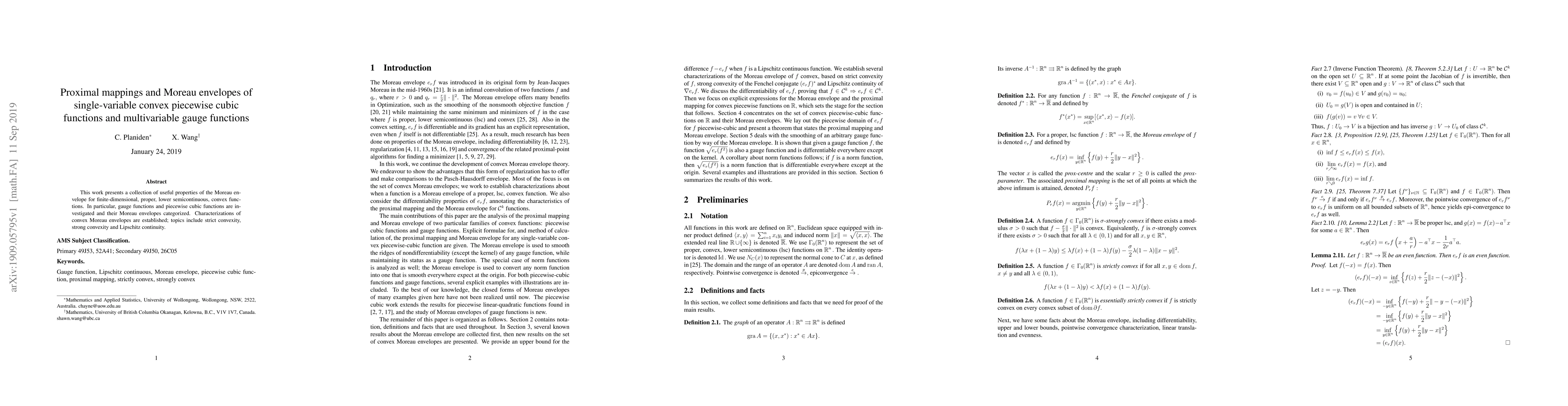 This paper explores the properties of Moreau envelopes for convex piecewise cubic functions and gauge functions, establishing their characterizations in terms of strict convexity, strong convexity, and Lipschitz continuity. The study categorizes these envelopes and provides useful insights into their proximal mappings.
