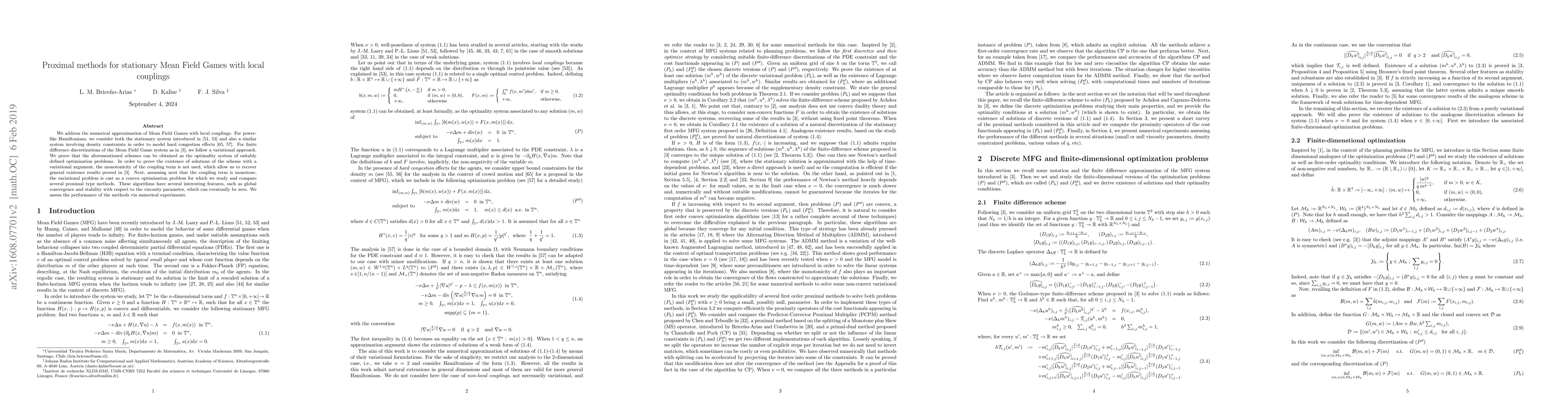 This paper develops proximal methods for numerically approximating stationary Mean Field Games with local couplings, focusing on both unconstrained and constrained systems to model congestion effects. The authors prove the existence of solutions and compare various proximal algorithms for solving the convex optimization problem, highlighting their global convergence and stability.