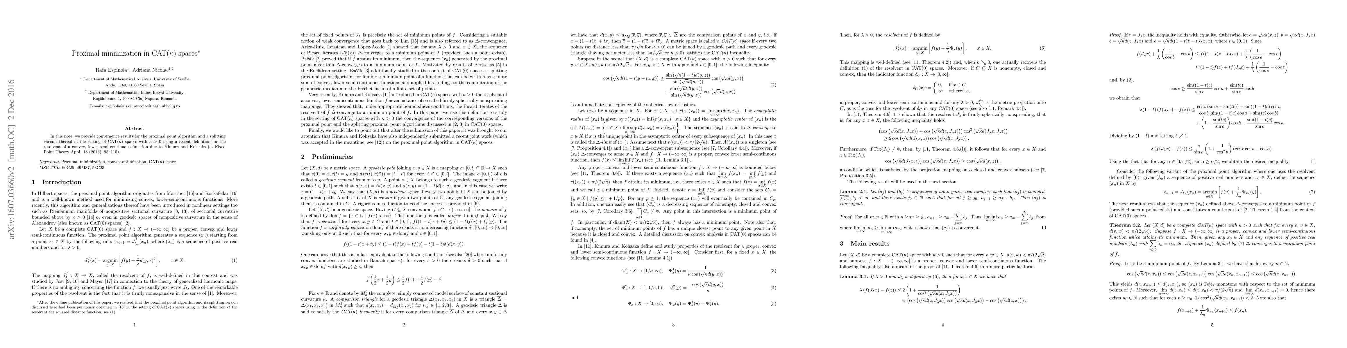 In this note, we provide convergence results for the proximal point algorithm and a splitting variant thereof in the setting of CAT$(\kappa)$ spaces with $\kappa > 0$ using a recent definition for the resolvent of a convex, lower semi-continuous function due to Kimura and Kohsaka (J. Fixed Point Theory Appl. 18 (2016), 93-115).