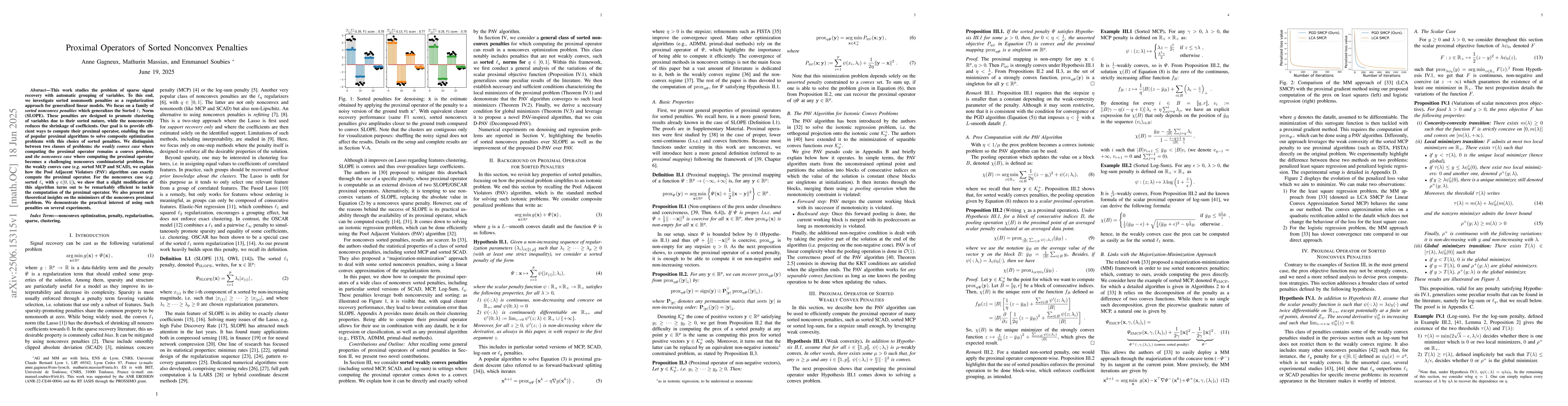 This work studies the problem of sparse signal recovery with automatic grouping of variables. To this end, we investigate sorted nonsmooth penalties as a regularization approach for generalized linear models. We focus on a family of sorted nonconvex penalties which generalizes the Sorted L1 Norm (SLOPE). These penalties are designed to promote clustering of variables due to their sorted nature, while the nonconvexity reduces the shrinkage of coefficients. Our goal is to provide efficient ways to compute their proximal operator, enabling the use of popular proximal algorithms to solve composite optimization problems with this choice of sorted penalties. We distinguish between two classes of problems: the weakly convex case where computing the proximal operator remains a convex problem, and the nonconvex case where computing the proximal operator becomes a challenging nonconvex combinatorial problem. For the weakly convex case (e.g. sorted MCP and SCAD), we explain how the Pool Adjacent Violators (PAV) algorithm can exactly compute the proximal operator. For the nonconvex case (e.g. sorted Lq with q in ]0,1[), we show that a slight modification of this algorithm turns out to be remarkably efficient to tackle the computation of the proximal operator. We also present new theoretical insights on the minimizers of the nonconvex proximal problem. We demonstrate the practical interest of using such penalties on several experiments.
