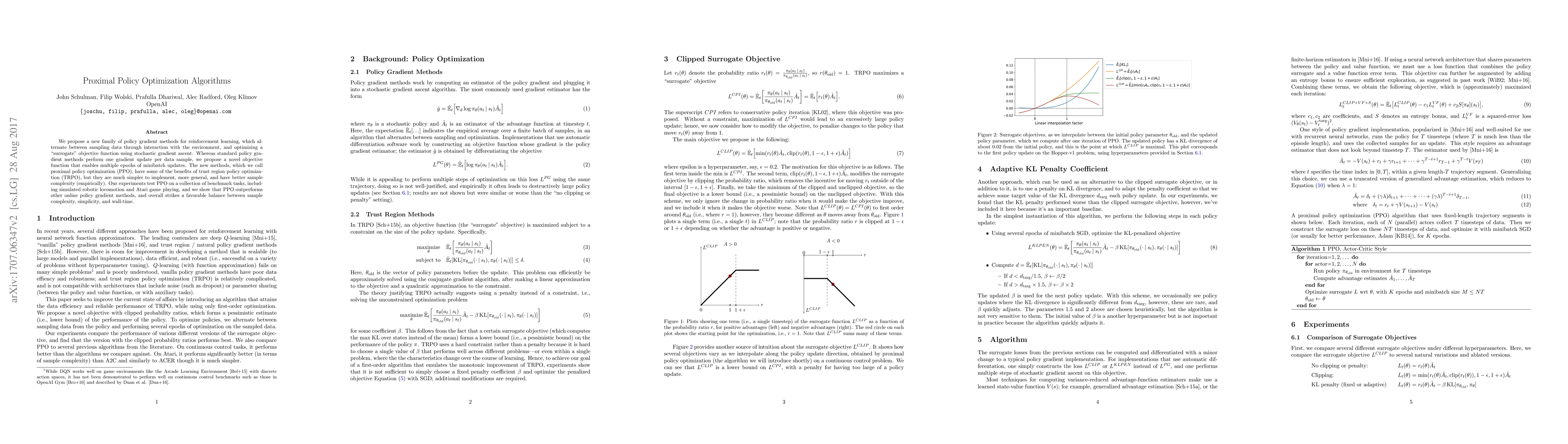 We propose a new family of policy gradient methods for reinforcement learning, which alternate between sampling data through interaction with the environment, and optimizing a "surrogate" objective function using stochastic gradient ascent. Whereas standard policy gradient methods perform one gradient update per data sample, we propose a novel objective function that enables multiple epochs of minibatch updates. The new methods, which we call proximal policy optimization (PPO), have some of the benefits of trust region policy optimization (TRPO), but they are much simpler to implement, more general, and have better sample complexity (empirically). Our experiments test PPO on a collection of benchmark tasks, including simulated robotic locomotion and Atari game playing, and we show that PPO outperforms other online policy gradient methods, and overall strikes a favorable balance between sample complexity, simplicity, and wall-time.
