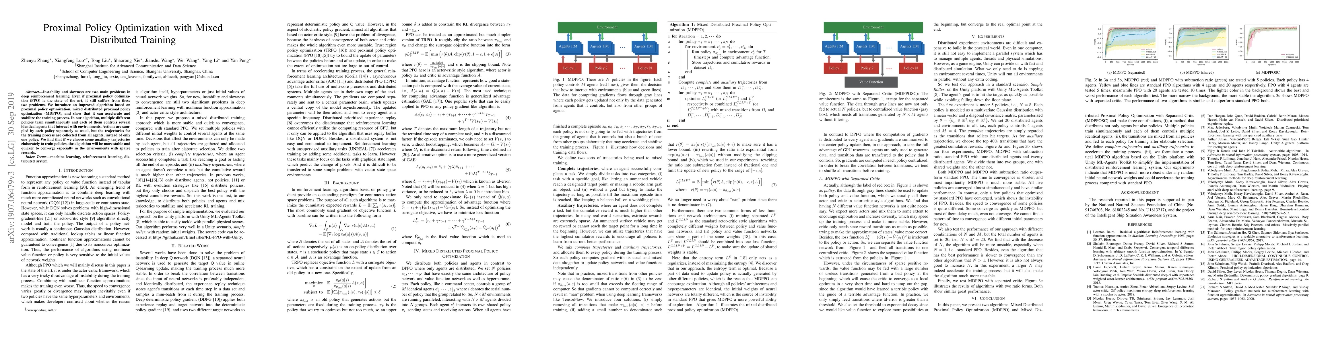 Instability and slowness are two main problems in deep reinforcement learning. Even if proximal policy optimization (PPO) is the state of the art, it still suffers from these two problems. We introduce an improved algorithm based on proximal policy optimization, mixed distributed proximal policy optimization (MDPPO), and show that it can accelerate and stabilize the training process. In our algorithm, multiple different policies train simultaneously and each of them controls several identical agents that interact with environments. Actions are sampled by each policy separately as usual, but the trajectories for the training process are collected from all agents, instead of only one policy. We find that if we choose some auxiliary trajectories elaborately to train policies, the algorithm will be more stable and quicker to converge especially in the environments with sparse rewards.