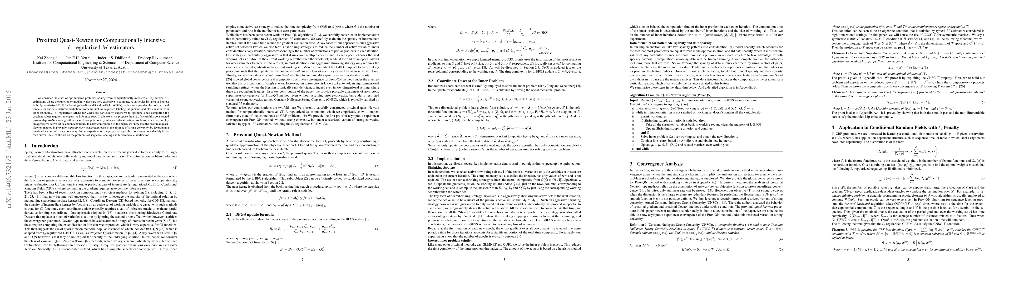 We consider the class of optimization problems arising from computationally intensive L1-regularized M-estimators, where the function or gradient values are very expensive to compute. A particular instance of interest is the L1-regularized MLE for learning Conditional Random Fields (CRFs), which are a popular class of statistical models for varied structured prediction problems such as sequence labeling, alignment, and classification with label taxonomy. L1-regularized MLEs for CRFs are particularly expensive to optimize since computing the gradient values requires an expensive inference step. In this work, we propose the use of a carefully constructed proximal quasi-Newton algorithm for such computationally intensive M-estimation problems, where we employ an aggressive active set selection technique. In a key contribution of the paper, we show that the proximal quasi-Newton method is provably super-linearly convergent, even in the absence of strong convexity, by leveraging a restricted variant of strong convexity. In our experiments, the proposed algorithm converges considerably faster than current state-of-the-art on the problems of sequence labeling and hierarchical classification.