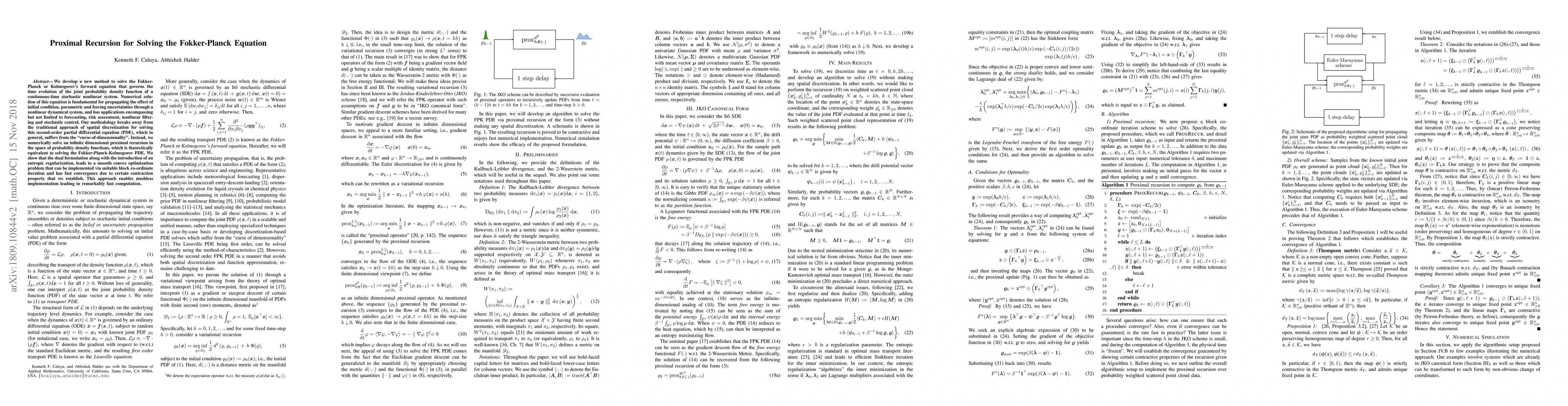 We develop a new method to solve the Fokker-Planck or Kolmogorov's forward equation that governs the time evolution of the joint probability density function of a continuous-time stochastic nonlinear system. Numerical solution of this equation is fundamental for propagating the effect of initial condition, parametric and forcing uncertainties through a nonlinear dynamical system, and has applications encompassing but not limited to forecasting, risk assessment, nonlinear filtering and stochastic control. Our methodology breaks away from the traditional approach of spatial discretization for solving this second-order partial differential equation (PDE), which in general, suffers from the "curse-of-dimensionality". Instead, we numerically solve an infinite dimensional proximal recursion in the space of probability density functions, which is theoretically equivalent to solving the Fokker-Planck-Kolmogorov PDE. We show that the dual formulation along with the introduction of an entropic regularization, leads to a smooth convex optimization problem that can be implemented via suitable block co-ordinate iteration and has fast convergence due to certain contraction property that we establish. This approach enables meshless implementation leading to remarkably fast computation.