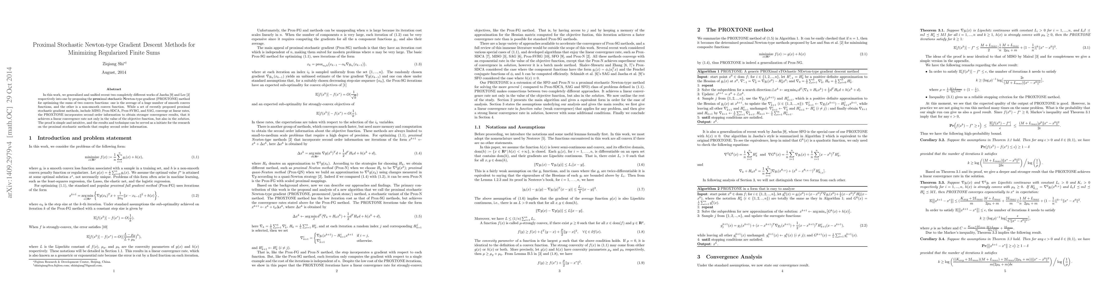 In this work, we generalized and unified recent two completely different works of Jascha \cite{sohl2014fast} and Lee \cite{lee2012proximal} respectively into one by proposing the \textbf{prox}imal s\textbf{to}chastic \textbf{N}ewton-type gradient (PROXTONE) method for optimizing the sums of two convex functions: one is the average of a huge number of smooth convex functions, and the other is a non-smooth convex function. While a set of recently proposed proximal stochastic gradient methods, include MISO, Prox-SDCA, Prox-SVRG, and SAG, converge at linear rates, the PROXTONE incorporates second order information to obtain stronger convergence results, that it achieves a linear convergence rate not only in the value of the objective function, but also in the \emph{solution}. The proof is simple and intuitive, and the results and technique can be served as a initiate for the research on the proximal stochastic methods that employ second order information.
