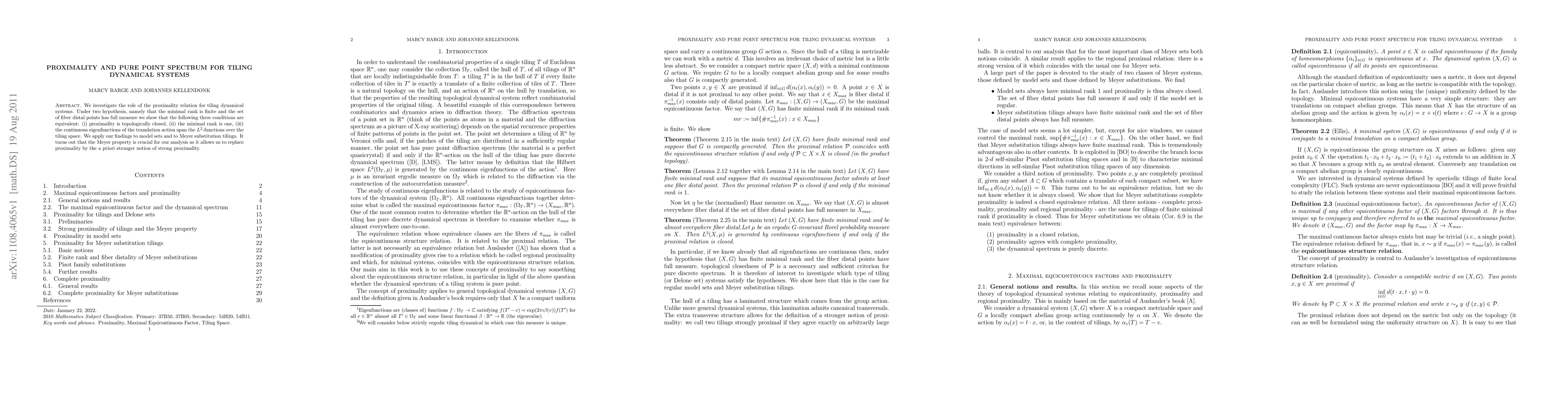 This paper examines the connection between proximality and the pure point spectrum in tiling dynamical systems, proving equivalences under specific conditions. It finds that when minimal rank is finite and fiber distal points are prevalent, proximality is closed if the minimal rank is one and eigenfunctions span L^2 functions, applying these results to model sets and Meyer substitution tilings.