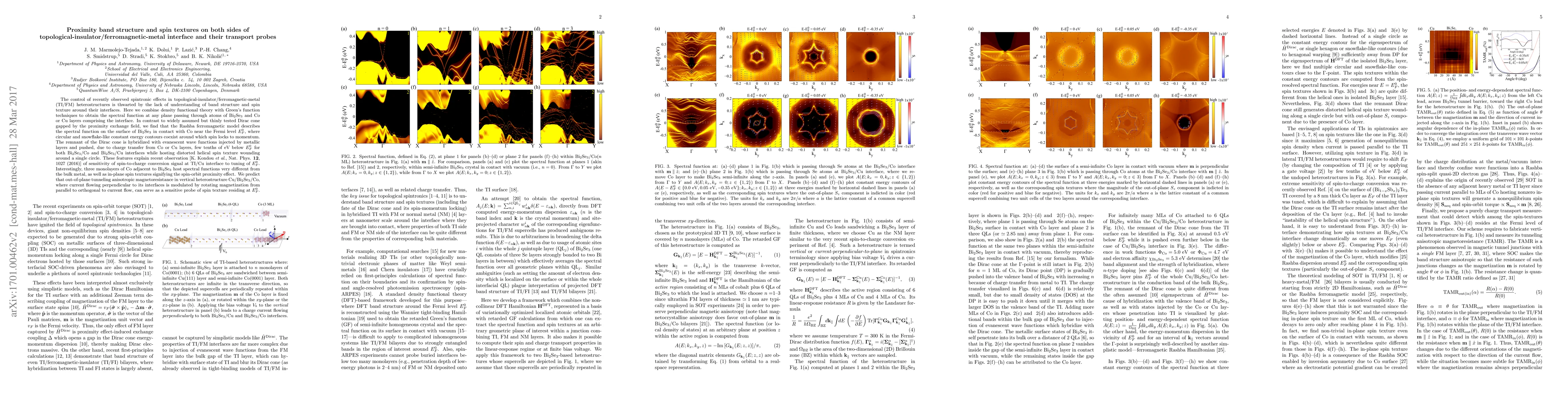 The control of recently observed spintronic effects in topological-insulator/ferromagnetic-metal (TI/FM) heterostructures is thwarted by the lack of understanding of band structure and spin texture around their interfaces. Here we combine density functional theory with Green's function techniques to obtain the spectral function at any plane passing through atoms of Bi$_2$Se$_3$ and Co or Cu layers comprising the interface. In contrast to widely assumed but thinly tested Dirac cone gapped by the proximity exchange field, we find that the Rashba ferromagnetic model describes the spectral function on the surface of Bi$_2$Se$_3$ in contact with Co near the Fermi level $E_F^0$, where circular and snowflake-like constant energy contours coexist around which spin locks to momentum. The remnant of the Dirac cone is hybridized with evanescent wave functions injected by metallic layers and pushed, due to charge transfer from Co or Cu layers, few tenths of eV below $E_F^0$ for both Bi$_2$Se$_3$/Co and Bi$_2$Se$_3$/Cu interfaces while hosting distorted helical spin texture wounding around a single circle. These features explain recent observation [K. Kondou {\em et al.}, Nat. Phys. {\bf 12}, 1027 (2016)] of sensitivity of spin-to-charge conversion signal at TI/Cu interface to tuning of $E_F^0$. Interestingly, three monolayers of Co adjacent to Bi$_2$Se$_3$ host spectral functions very different from the bulk metal, as well as in-plane spin textures signifying the spin-orbit proximity effect. We predict that out-of-plane tunneling anisotropic magnetoresistance in vertical heterostructure Cu/Bi$_2$Se$_3$/Co, where current flowing perpendicular to its interfaces is modulated by rotating magnetization from parallel to orthogonal to current flow, can serve as a sensitive probe of spin texture residing at $E_F^0$.