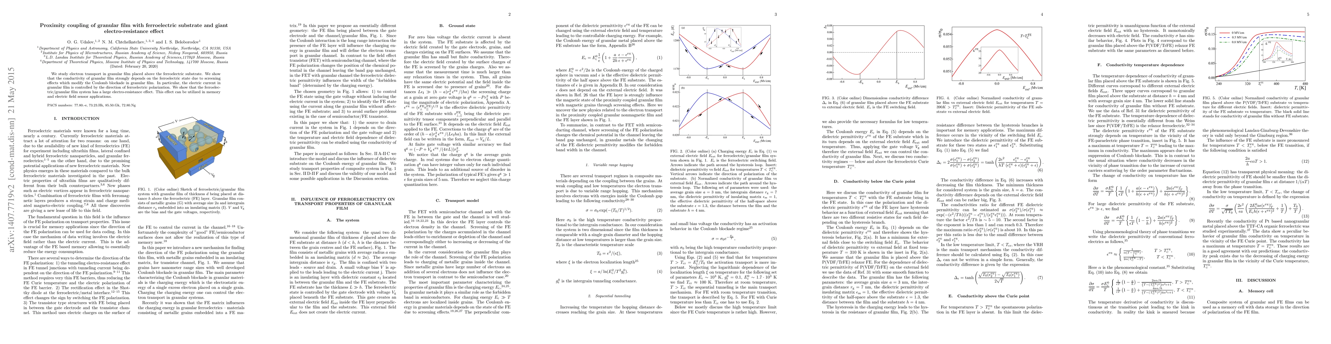 We study electron transport in granular film placed above the ferroelectric substrate. We show that the conductivity of granular film strongly depends on the ferroelectric state due to screening effects which modify the Coulomb blockade in granular film. In particular, the electric current in granular film is controlled by the direction of ferroelectric polarization. We show that the ferroelectric/granular film system has a large electro-resistance effect. This effect can be utilized in memory and electric field sensor applications.