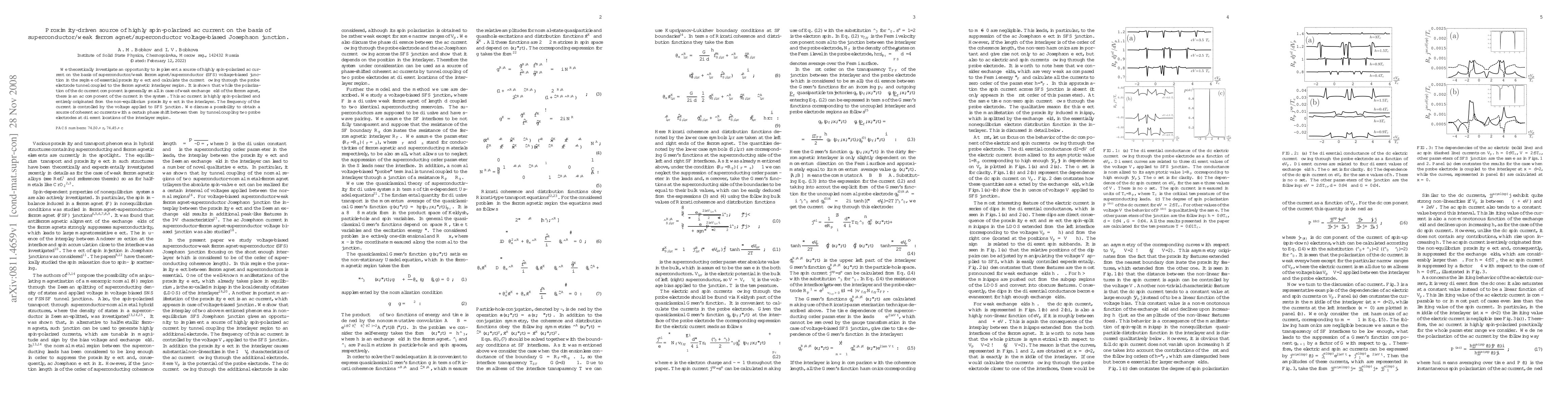 This paper theoretically explores a superconductor/weak ferromagnet/superconductor (SFS) voltage-biased junction as a source of highly spin-polarized ac current, driven by the proximity effect. The study finds that while dc current polarization is minimal, an ac component is highly spin-polarized and frequency-controlled by the applied voltage.